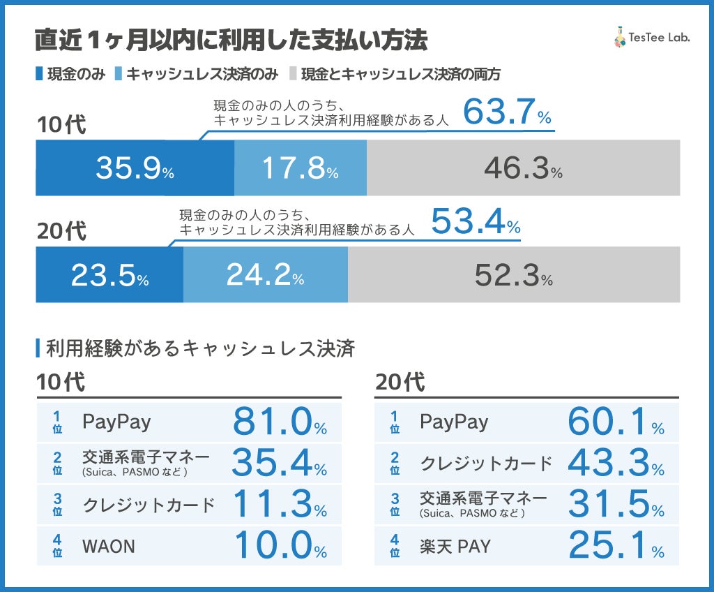 リサーチ事業・プロモーション事業・マーケティング事業を展開する株式会社テスティー(本社:東京都渋谷区、代表取締役:服部峻介)は、若年層リサーチ結果を発信する「TesTee Lab」にて、10代・20代の男女1,375名(10代男女691名、20代男女684名)を対象に「キャッシュレス決済」に関する調査を実施しました。