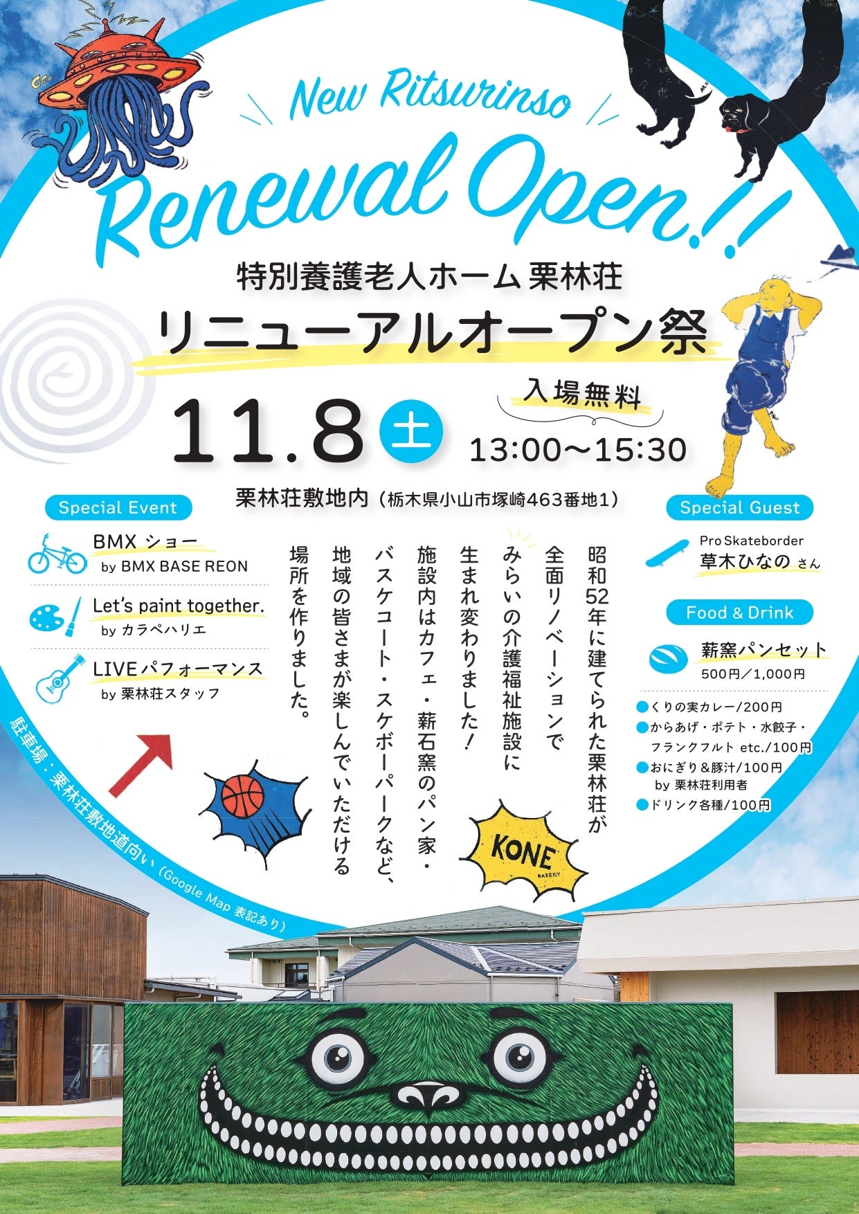 社会福祉法人丹緑会(栃木県小山市 理事長:山中桓夫、以下「当法人」)が運営する特別養護老人ホーム栗林荘は、日本財団「みらいの福祉施設建築プロジェクト 2021」の採択も経て、この度リニューアルオープン祭を11/8(土)13:00〜15:30に開催致します。約50年間 地域の方々と共に歩んできた栗林荘は、このリニューアルを機に「介護施設」という枠を超えて、誰もが集い、つながり合える“ひらかれた居場所”として生まれ変わります。
