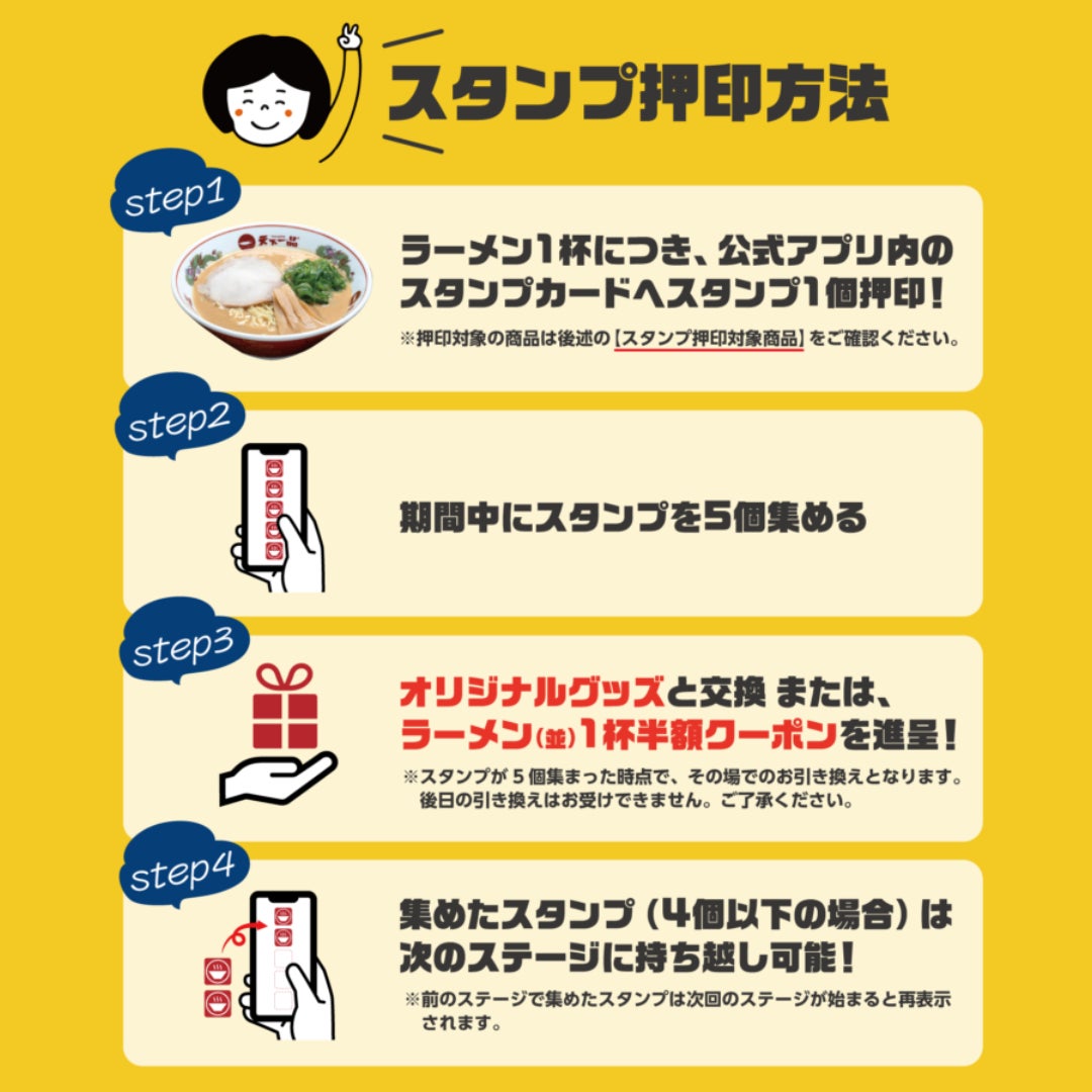 ※ラーメン(並)1杯半額クーポンのご利用方法につきましては、下記「アプリでスタンプカードキャンペーン」ページをご確認ください。