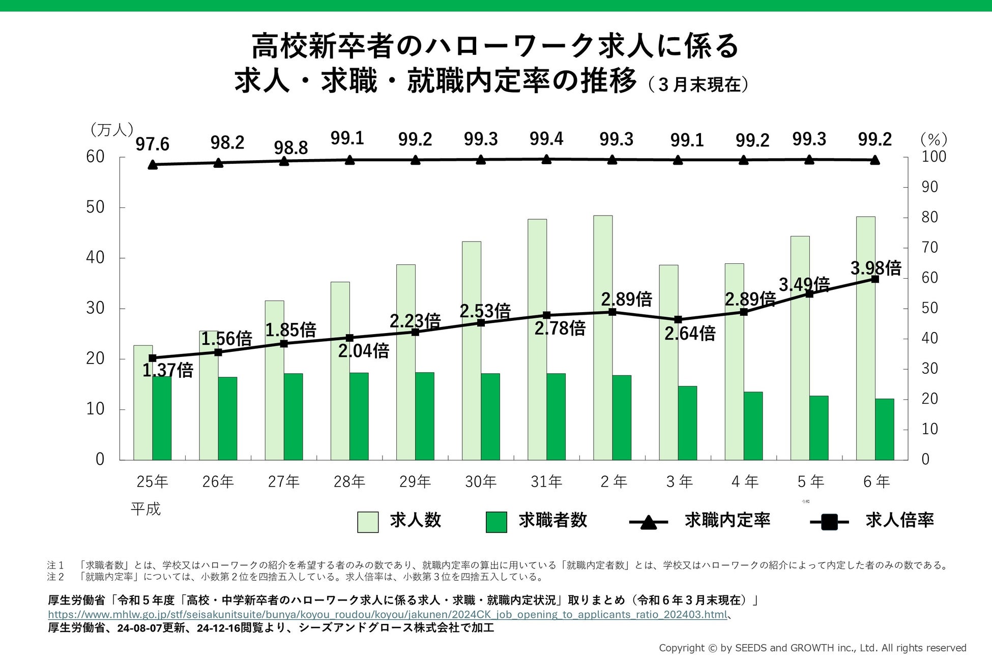 最新の統計によると、高卒採用における求人倍率は3.98倍と過去最高水準に達しています。高校生にとって企業の選択肢が増えている一方で、企業間での人材確保競争が激化していることを示しています。これは、人手不足により高卒採用へ新規参入する企業の増加や、少子化および進学率の上昇による高校生の求職者減少などによるものと考えられます。
