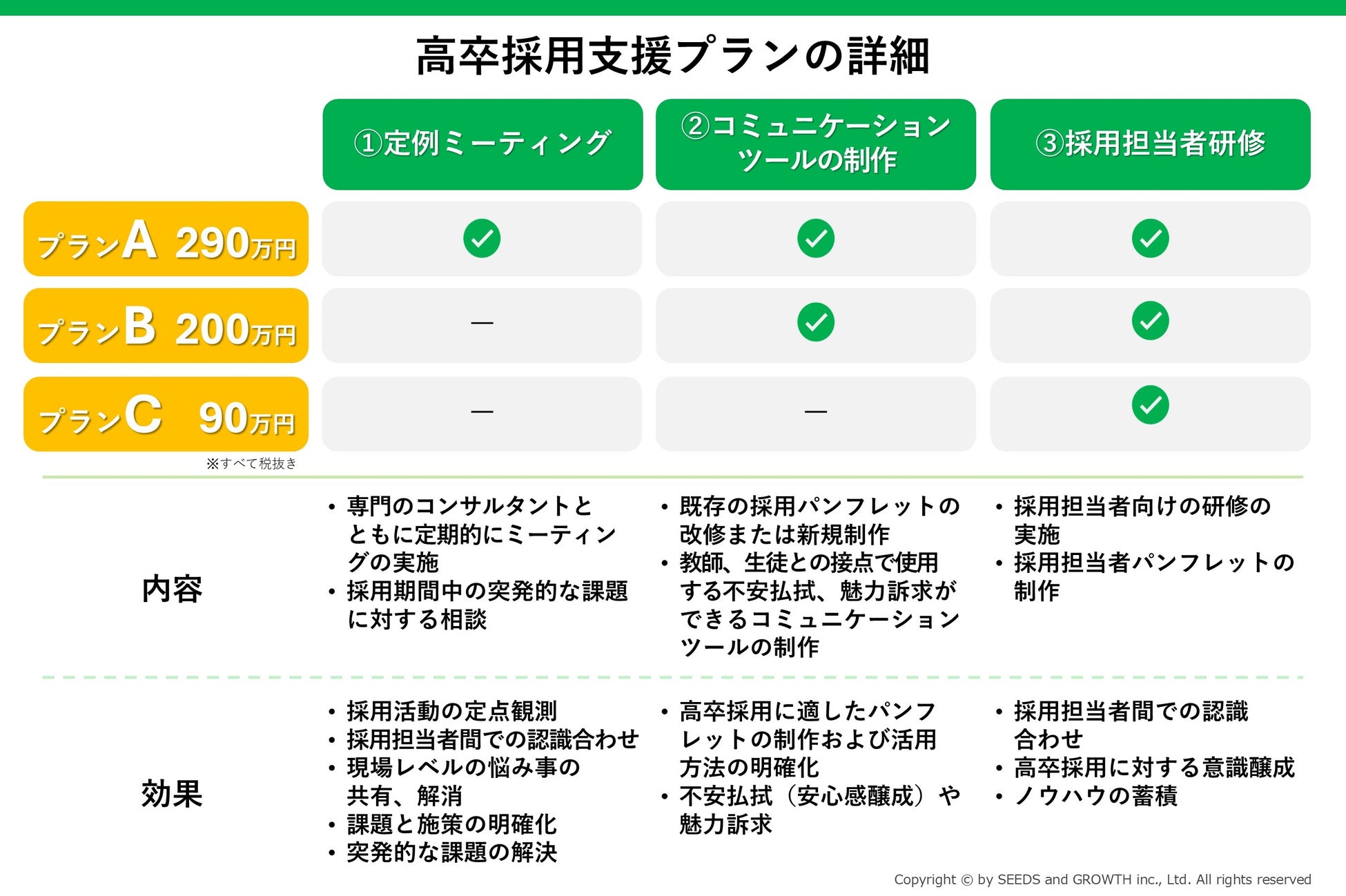 本サービスは、以下の3つのプランを通じて、企業の高卒採用成功を1から10まで伴走いたします。