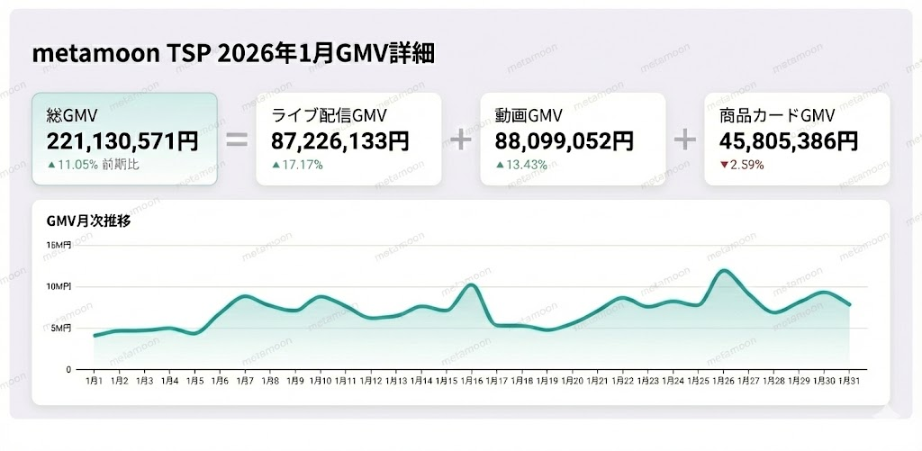 TikTok Shopの日本市場が本格成長フェーズに入る中、ブランド企業による「TikTok Shopアカウント運営」、「広告運用」、「ライブ配信実施」、「ショート動画制作」への需要が急速に拡大しています。TikTok公式認定パートナー(TSP)である「metamoon」は、2026年1月に月間GMV2.21億円を記録し、2025年11月より3ヶ月連続で月間GMV2億円を突破したことをお知らせいたします。また同社は25年Q3・Q4において、日本国内提携セラー数・ショート動画配信本数・契約店舗総GMVの3指標で第一位を獲得しています。