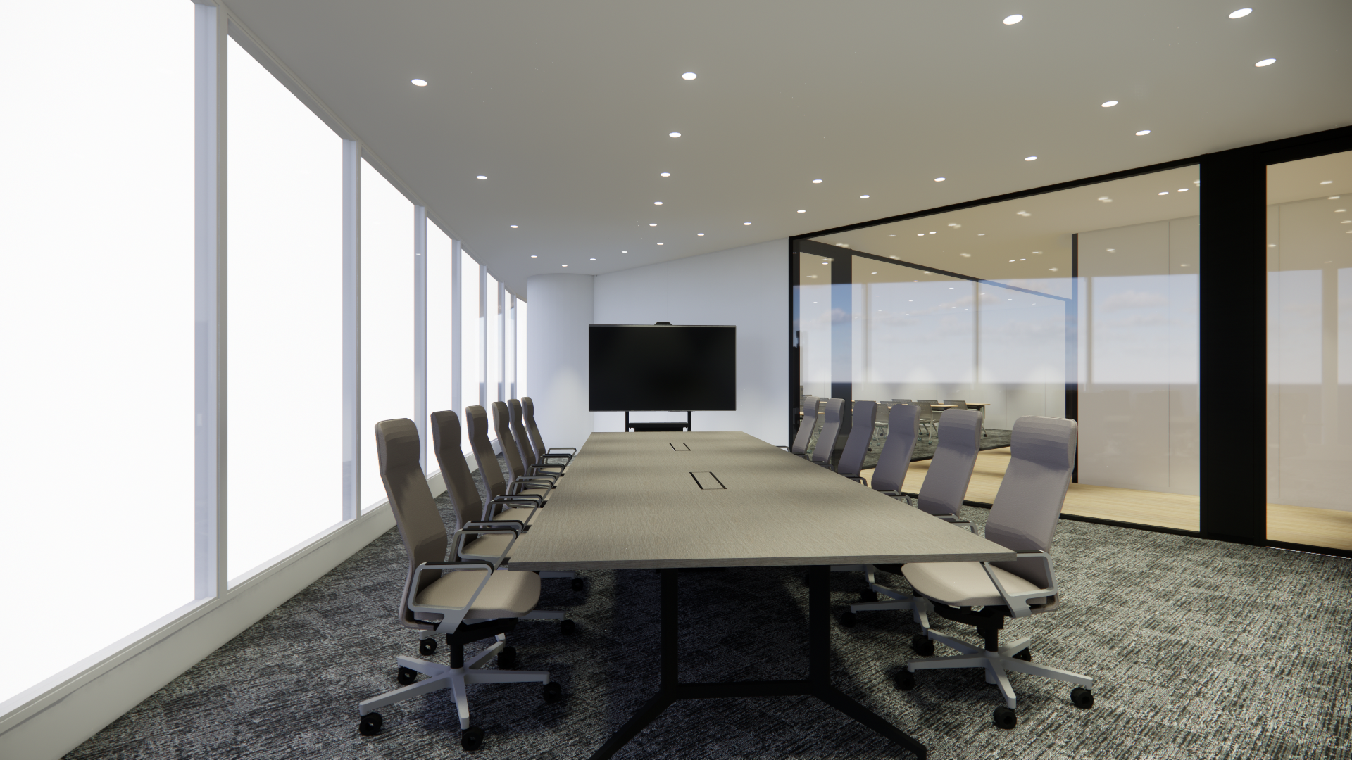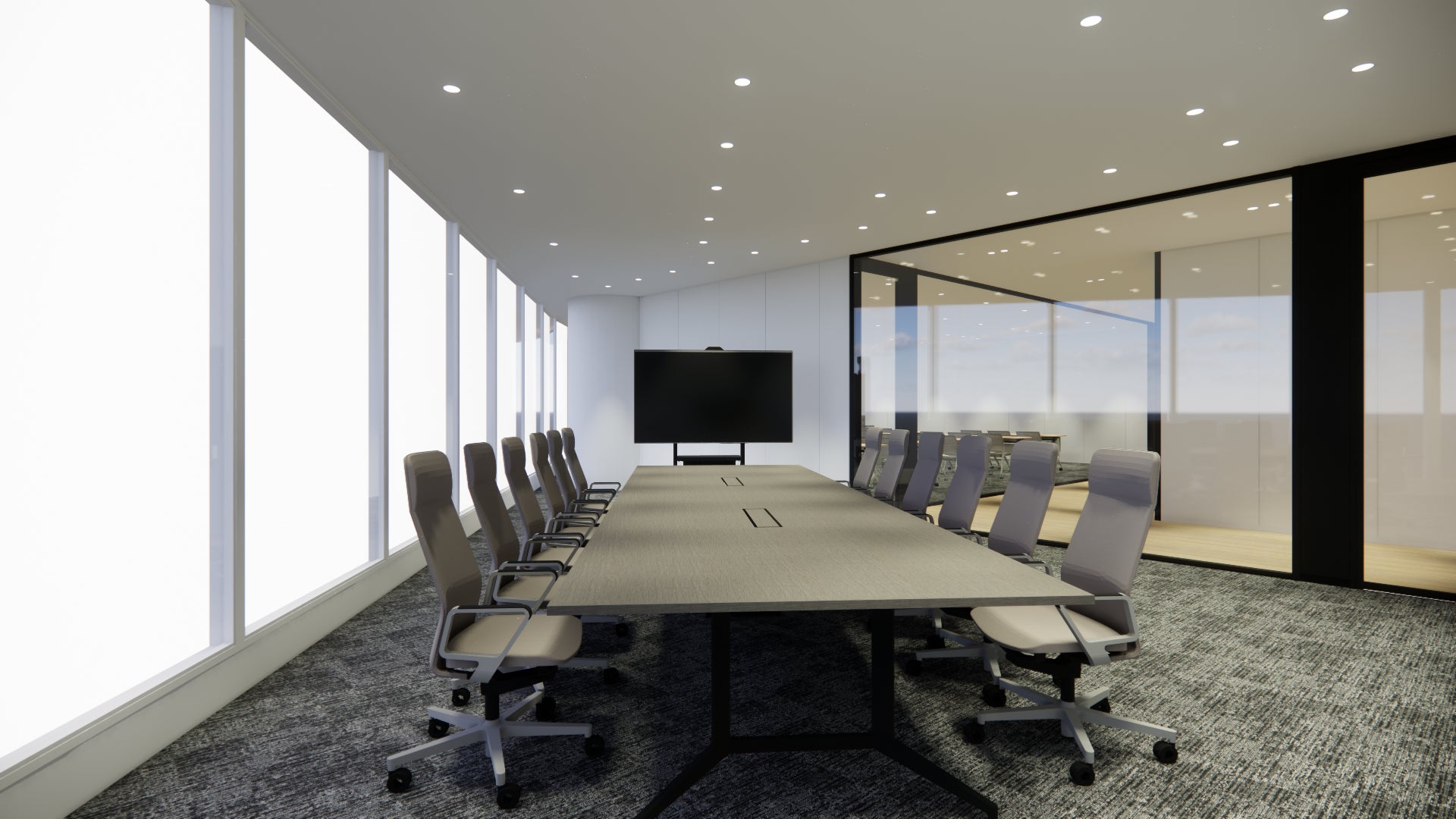 会議室はガラス張りの開放的な設計で、透明性の高いコミュニケーションを実現しています。