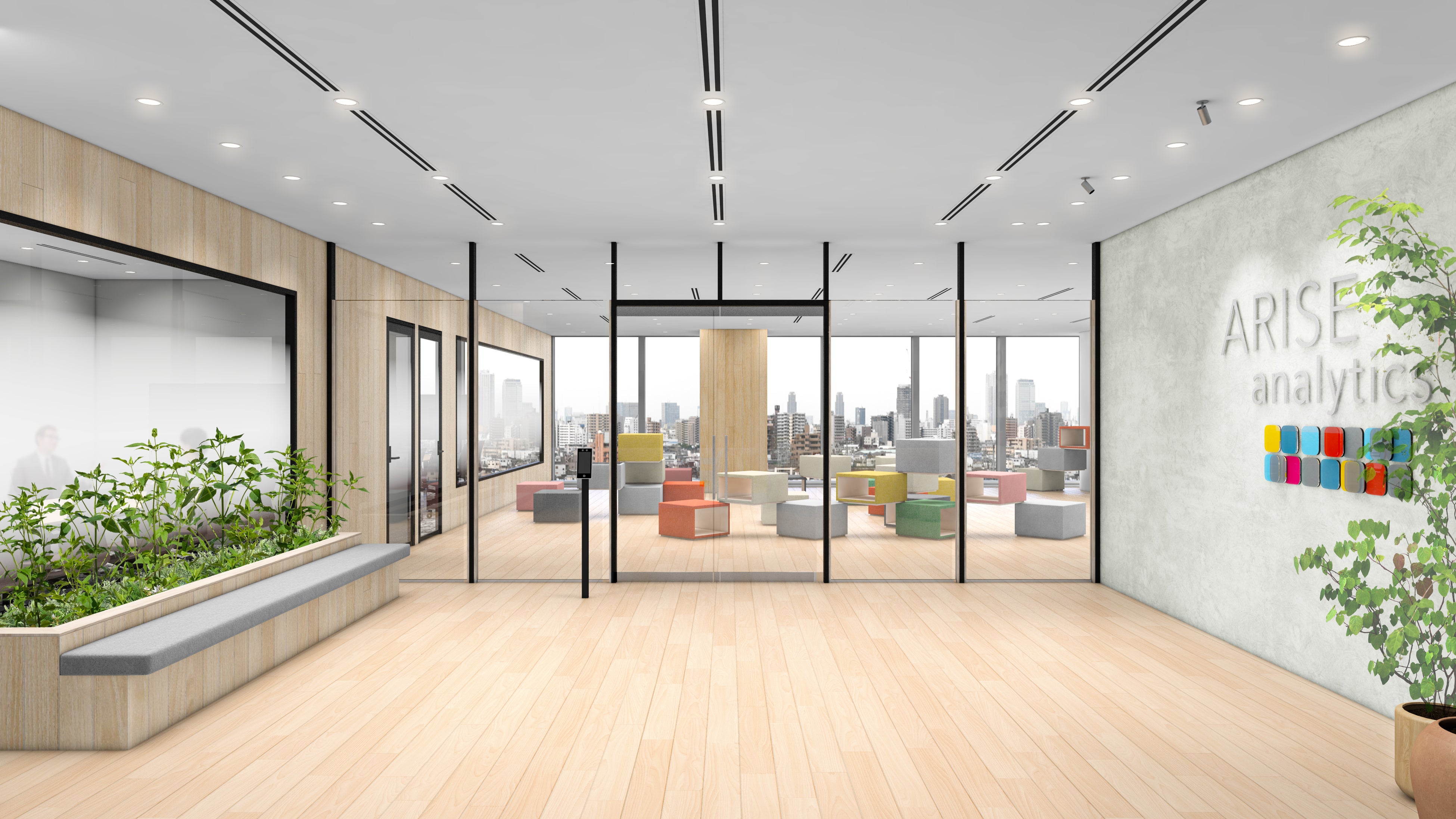 エントランス横のラウンジスペースには、ARISE analyticsのロゴを立体的に表現したキューブを配置しました。膨大なデータから価値を生み出す事業の特性と、多様なバックグラウンドを持つメンバーが一つのチームとして働く企業文化を象徴しています。