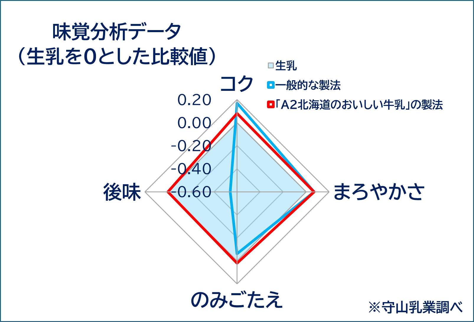 生乳の分析値を0として、一般的な製法と「MORIYAMA A2北海道のおいしい牛乳」の製法を比較したグラフです。一般的な製法と比較して、生乳本来の風味により近い味わいですので、これまで牛乳が合わなかった方にも、ぜひお試しいただければ幸いです。
