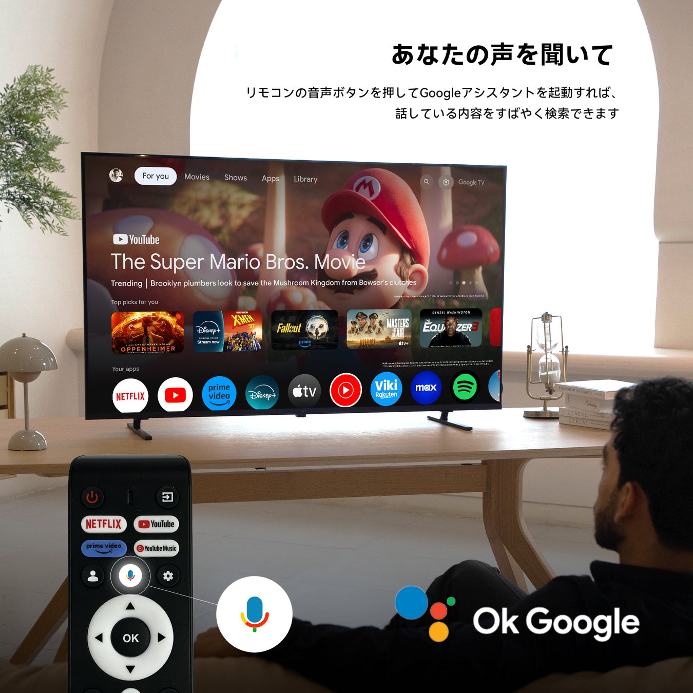 Googleアシスタント音声コントロール:リモコンからワンタッチで音声がオンになり、検索や操作ができます。「今日の天気は?」「最新映画を探して」など、話しかけるだけで応えてくれます。