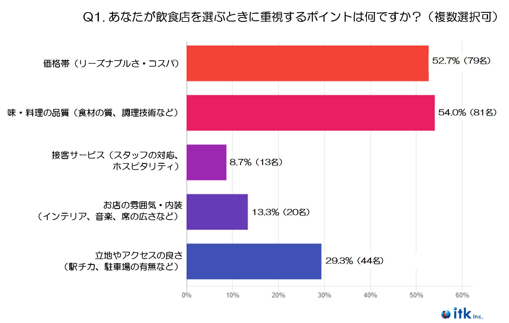 今回は、業界最大級の飲食店求人を誇る株式会社itk(https://i-t-k.co.jp/ )が、2024年12月25日に20代150名を対象にインタビューを実施しました。テーマは「飲食店選びの基準・重視するポイント」。