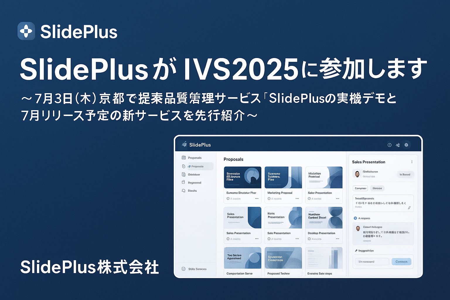 SlidePlus株式会社(本社:東京都渋谷区、代表取締役:宮城 新)は、2025年7月2日(水)〜4日(金)に京都市勧業館「みやこめっせ」で開催される国内最大規模のスタートアップカンファレンス「IVS2025」の「IVS Startup Market」に出展することをお知らせします。7月3日(木)のDay2にて、提案品質管理サービス「SlidePlus」の実機デモンストレーションを行うほか、7月より先行利用可能な新サービスを先行的にご紹介いたします。
