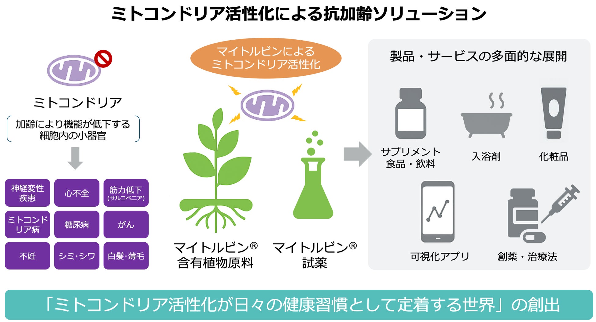 これまでサプリメントや入浴剤といった一般消費者向け製品を起点に研究成果の社会実装を進めてきましたが、今後は食品・飲料分野への応用に加え、医薬・化粧品・ペット・畜産分野を含む幅広い産業領域において、「ミトコンドリア活性化ソリューション事業」の展開を目指しています。
