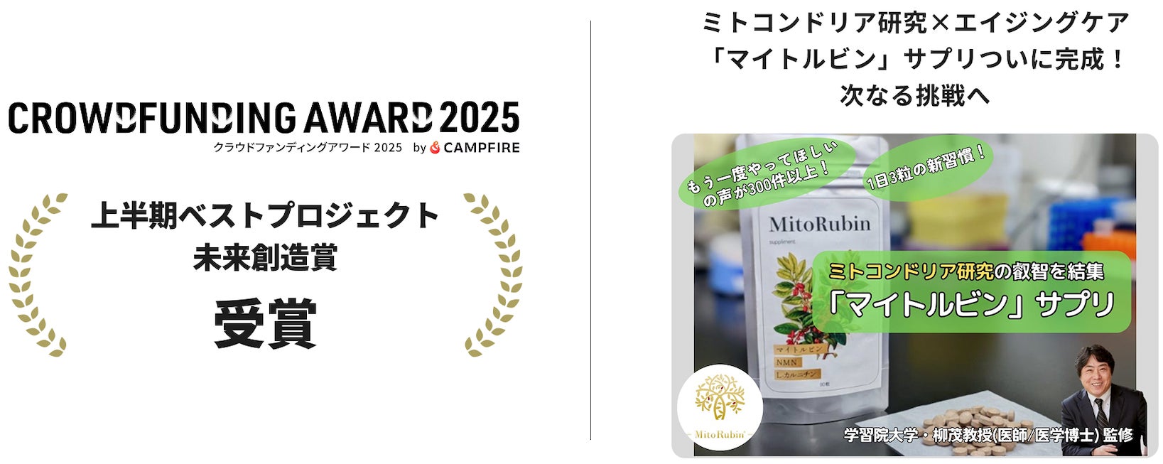 学習院大学発ベンチャーの株式会社マイトジェニック(本社:東京都新宿区)は、国内最大級のクラウドファンディングサービス「CAMPFIRE」が主催する「クラウドファンディングアワード2025」において、「上半期ベストプロジェクト/プロダクト・テック部門・未来創造賞」を受賞しました。