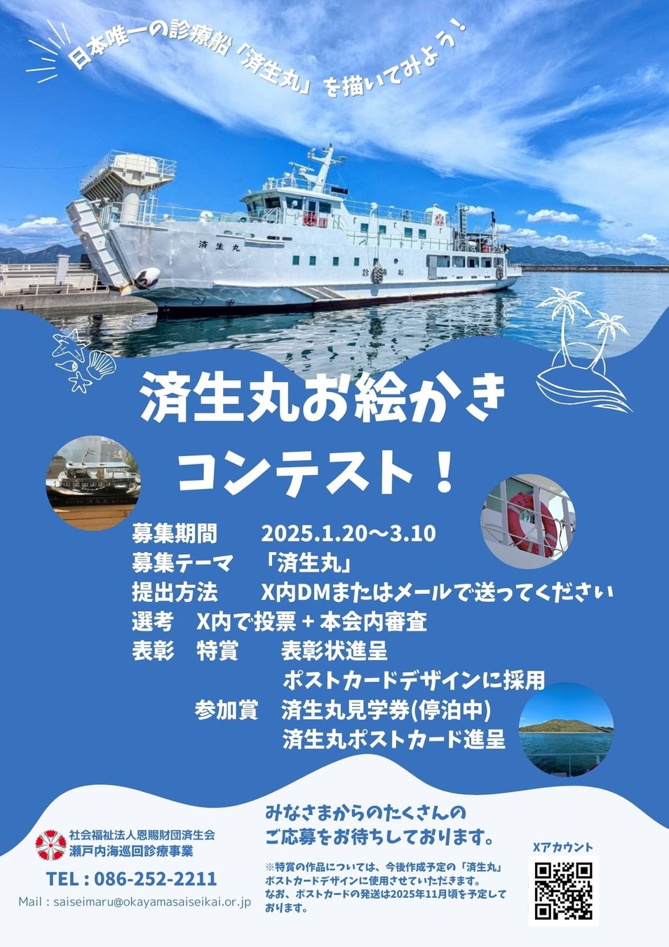 済生丸を共同運営している4県(岡山・広島・香川・愛媛)の済生会支部では、この度、済生丸事業をできるだけ多くの皆様に知っていただくことを目的に、「済生丸お絵かきコンテスト」を実施することといたしました。