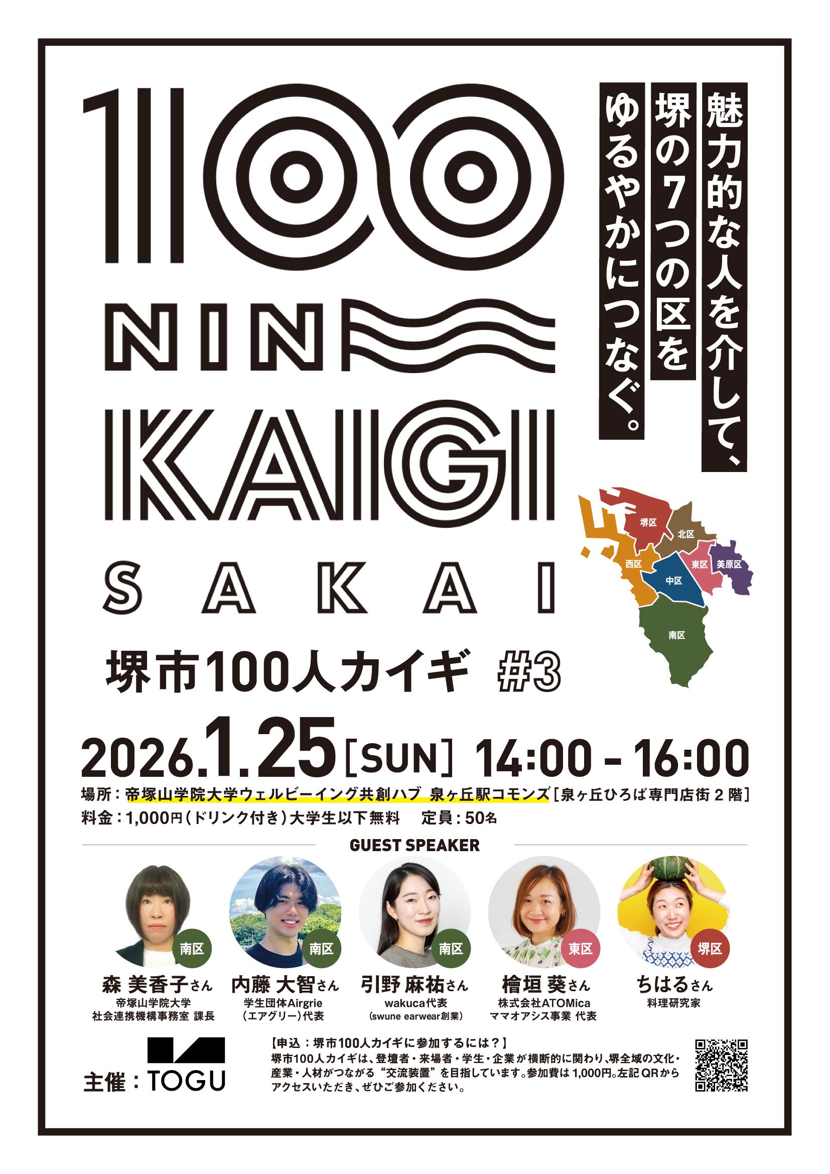 4回となる今回は、大阪公立大学イノベーションアカデミー スマートエネルギー棟にて開催します。 「大学」「観光」「自治体」「僧侶」「英語講師」と、全く異なる分野で活躍する5名のゲストが登壇。一見バラバラに見える活動の中に、堺というフィールドならではの共通点や、熱い想いを感じていただける場となります。学生は参加費無料とし、多世代間の交流も促進します。