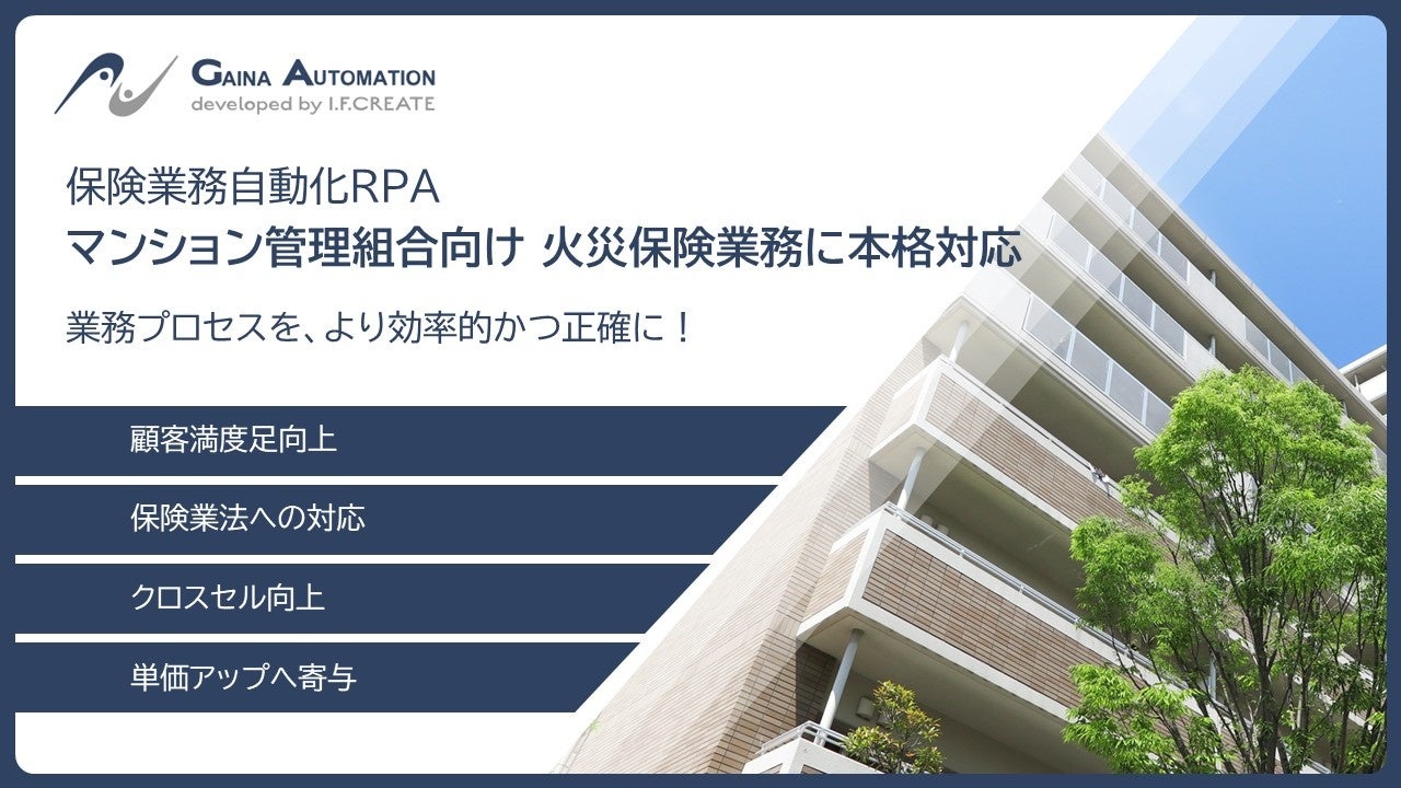 株式会社アイ・エフ・クリエイト(本社:東京都立川市、代表取締役:小川真一)は、保険代理店向けRPAツール「GAINA Automation RPA(https://www.ifcreate.com/gaina_automation/)」が、マンション管理組合向け火災保険業務に本格対応し、その自動化ソリューションをさらに強化したことをお知らせします。
