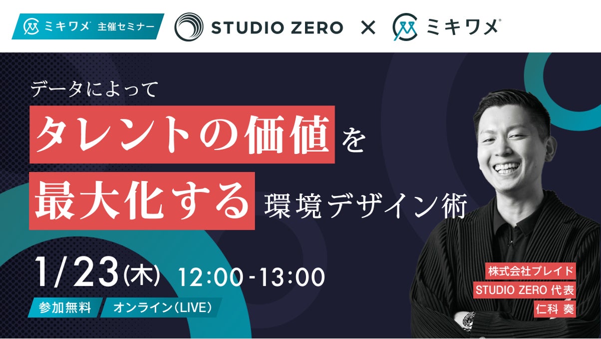 2025年1月23日(木)に開催される、人材分析に特化した適性検査「ミキワメ」を提供する株式会社リーディングマーク(東京都港区:代表取締役社長 飯田 悠司)が主催のオンラインセミナー「データによってタレントの価値を最大化する環境デザイン術」に、株式会社プレイド(東京都中央区:代表取締役CEO 倉橋 健太)の社内起業組織 STUDIO ZERO(スタジオゼロ)の仁科 奏が登壇します。