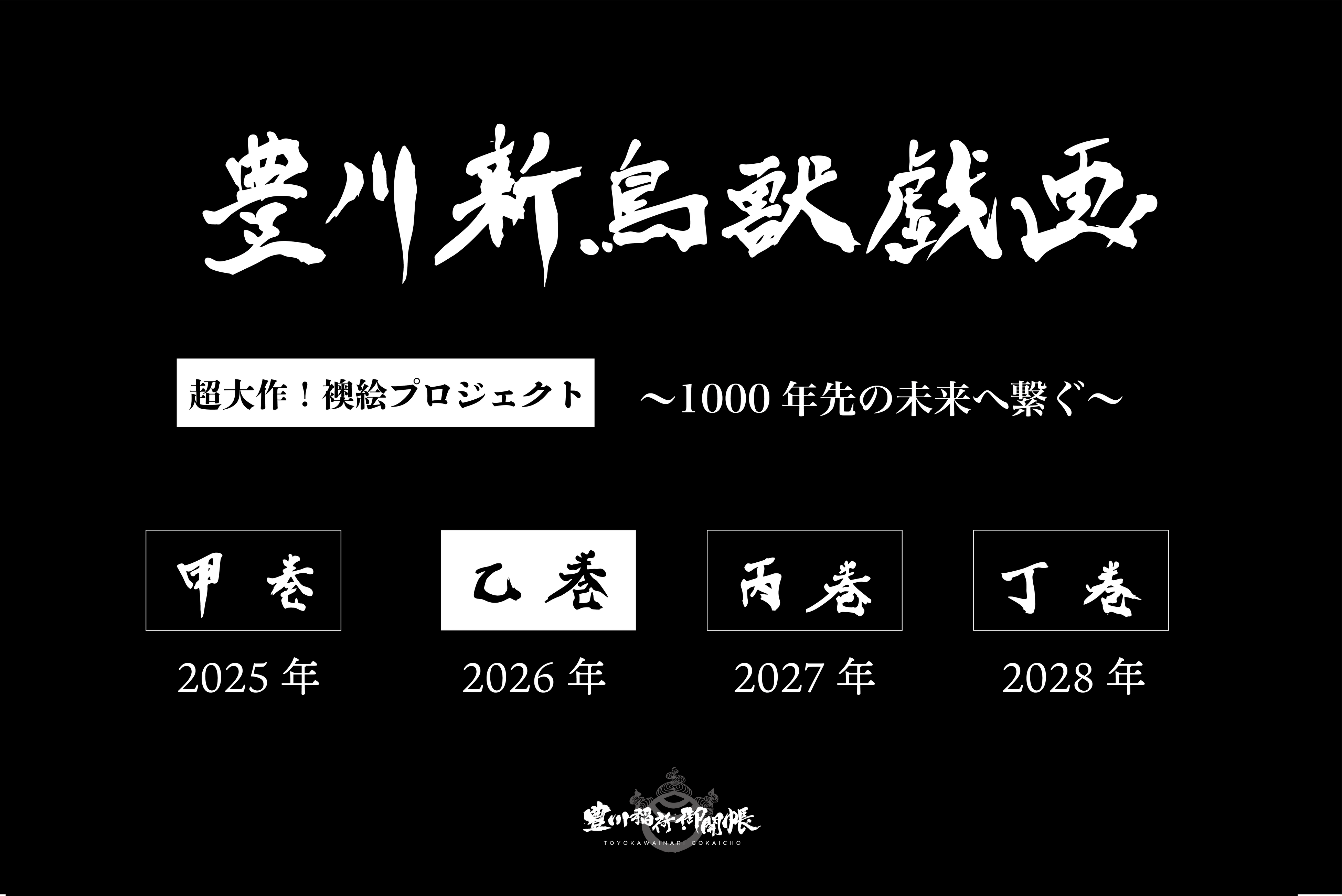 国宝・鳥獣戯画が甲乙丙丁の4巻から成る壮大な絵巻であるように、「豊川 新鳥獣戯画」も複数の章から構成される文化創造の挑戦となります。その第二弾である「乙巻」は、2026年4月から1年間をかけて制作され、豊川稲荷 御開帳期間中である2026年11月3日(火)に完成予定です。