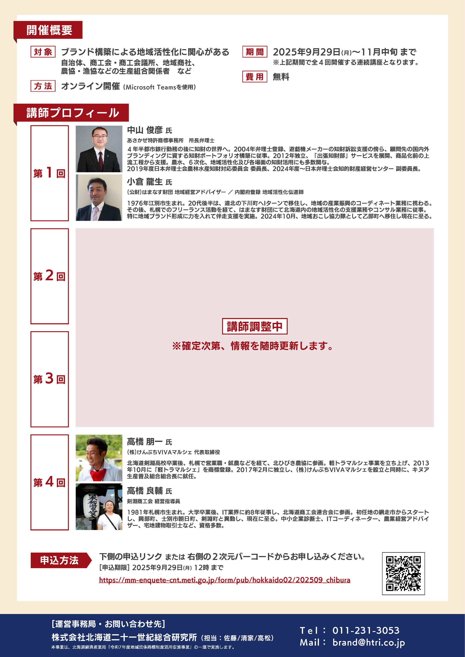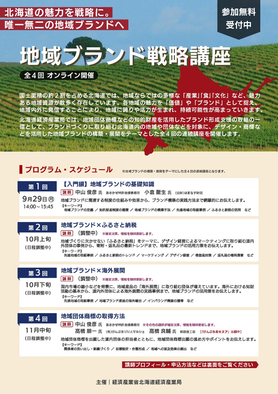 経済産業省北海道経済産業局は、北海道内の自治体や生産組合関係者などを対象に、地域団体商標などの知的財産を活用したブランド形成を支援するため、地域ブランドの構築・展開をテーマとした全4回のオンライン講座を開催します。