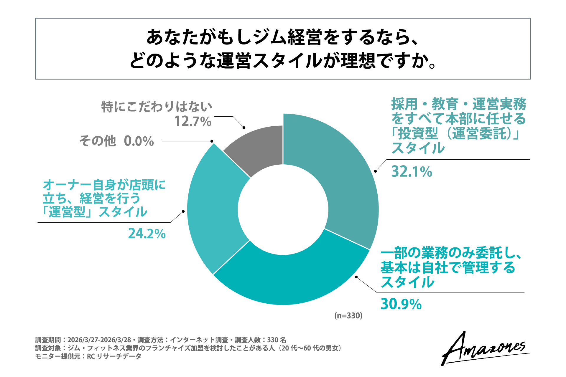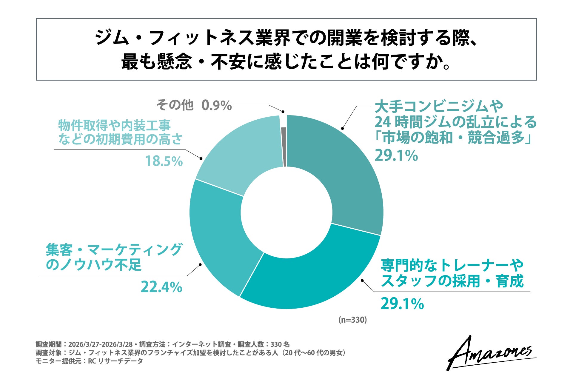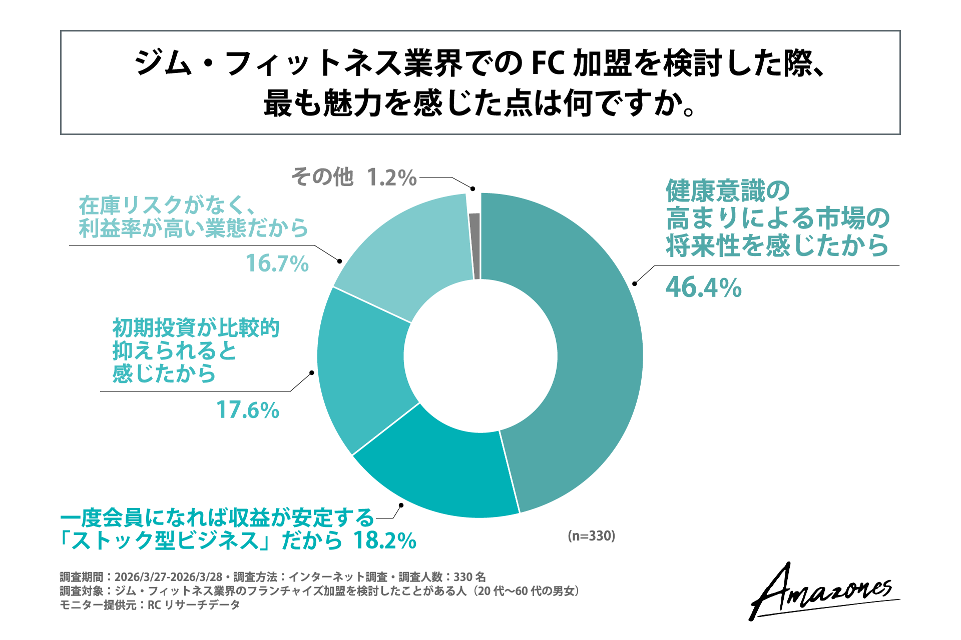人生100年時代、副業解禁の流れ、そしてジム・フィットネスの流行を背景に、「フランチャイズ(FC)ビジネス」への関心が高まっています。しかし、そのビジネスモデルは多様化しており、市場飽和や運営負担の重さから、多くの検討者が判断の難しさに直面していると推測されます。これまで、加盟検討者が「なぜ加盟を断念したのか」「本音で何を求めているのか」というリアルな実態データは不足していました。そこで「女性専用24時間ジムAmazones(アマゾネス)フランチャイズ」は、FC加盟検討者のビジネスモデル選定と課題意識を明らかにする目的で実施しました。