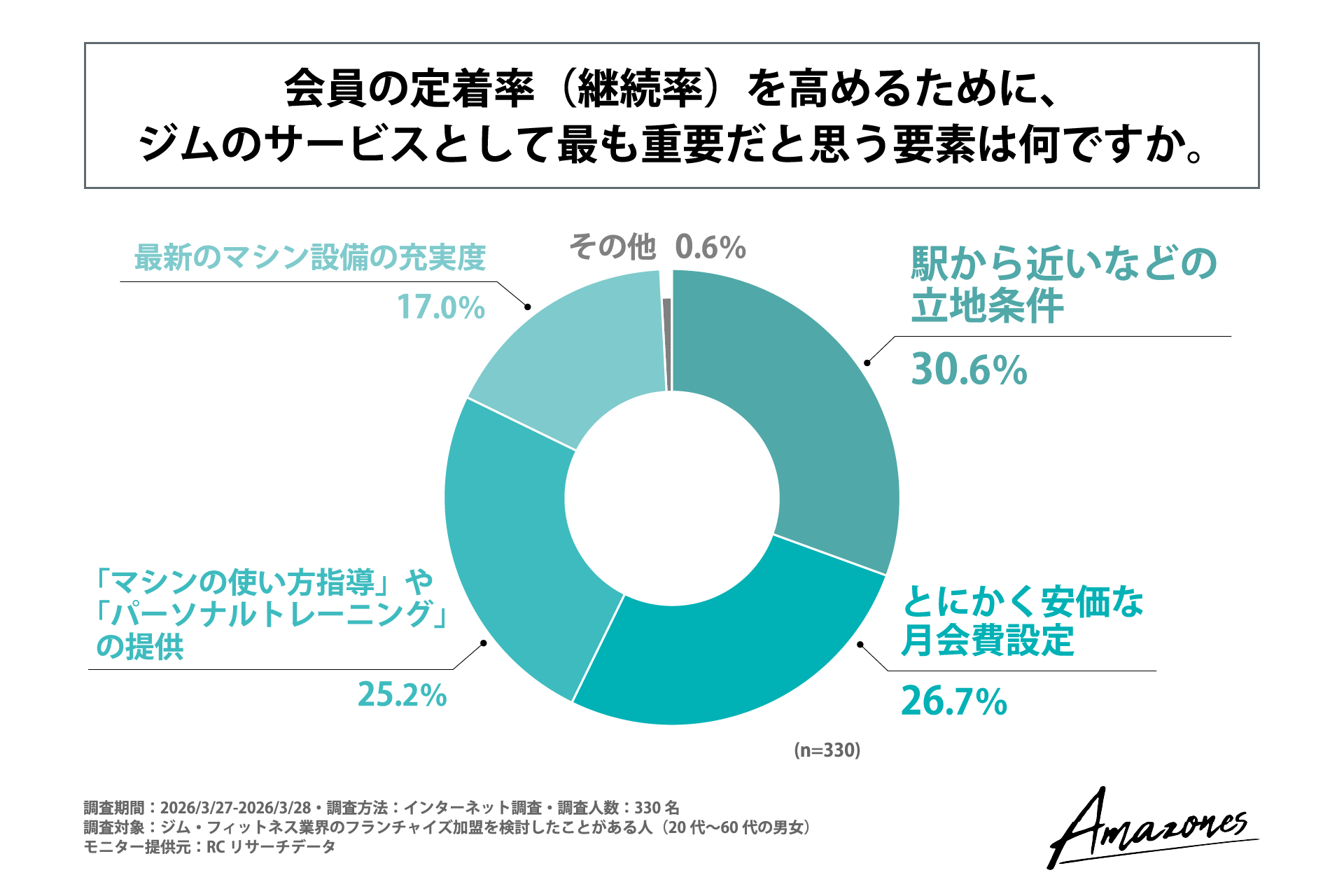また、「会員の定着率(継続率)を高めるために、ジムのサービスとして最も重要だと思う要素は何か」を尋ねる設問への回答では、1位が「駅から近いなどの立地条件」で30.6%、2位が「とにかく安価な月会費設定」で26.7%、3位が「『マシンの使い方指導』や『パーソナルトレーニング』の提供」で25.2%という結果になりました。この結果から、会員の定着率(継続率)を高めるためにジムのサービスとして最も重要だと考える要素は、「駅から近いなどの立地条件」であることがわかりました。