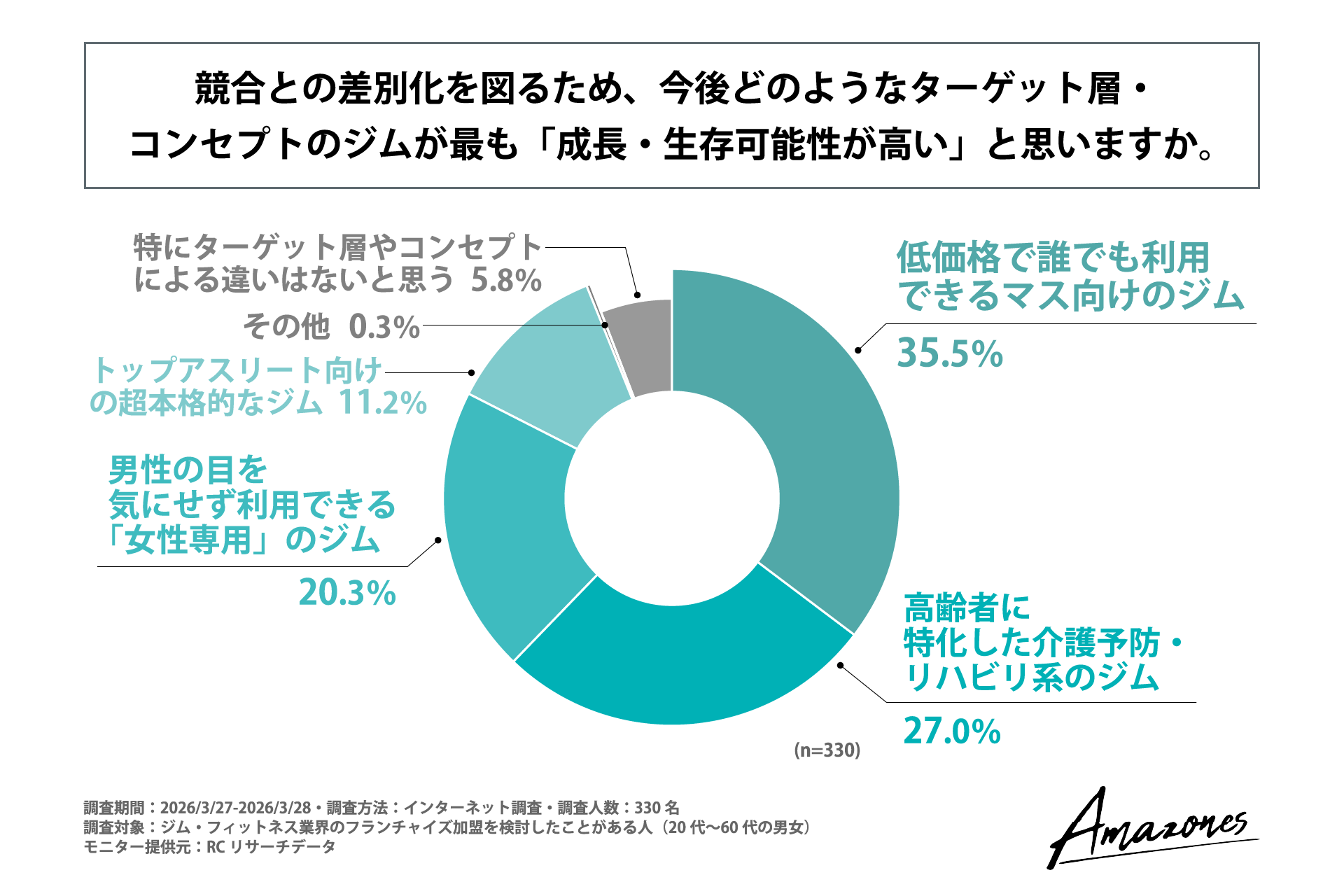 続いて、「競合との差別化を図るため、今後どのようなターゲット層・コンセプトのジムが最も『成長・生存可能性が高い』と思うか」を尋ねる設問への回答では、1位が「低価格で誰でも利用できるマス向けのジム」で35.5%、2位が「高齢者に特化した介護予防・リハビリ系のジム」で27.0%、3位が「男性の目を気にせず利用できる『女性専用』のジム」で20.3%という結果になりました。この結果から、競合との差別化を図り今後最も「成長・生存可能性が高い」と考えるジムのコンセプトは、「低価格なマス向けのジム」であることが明らかになりました。