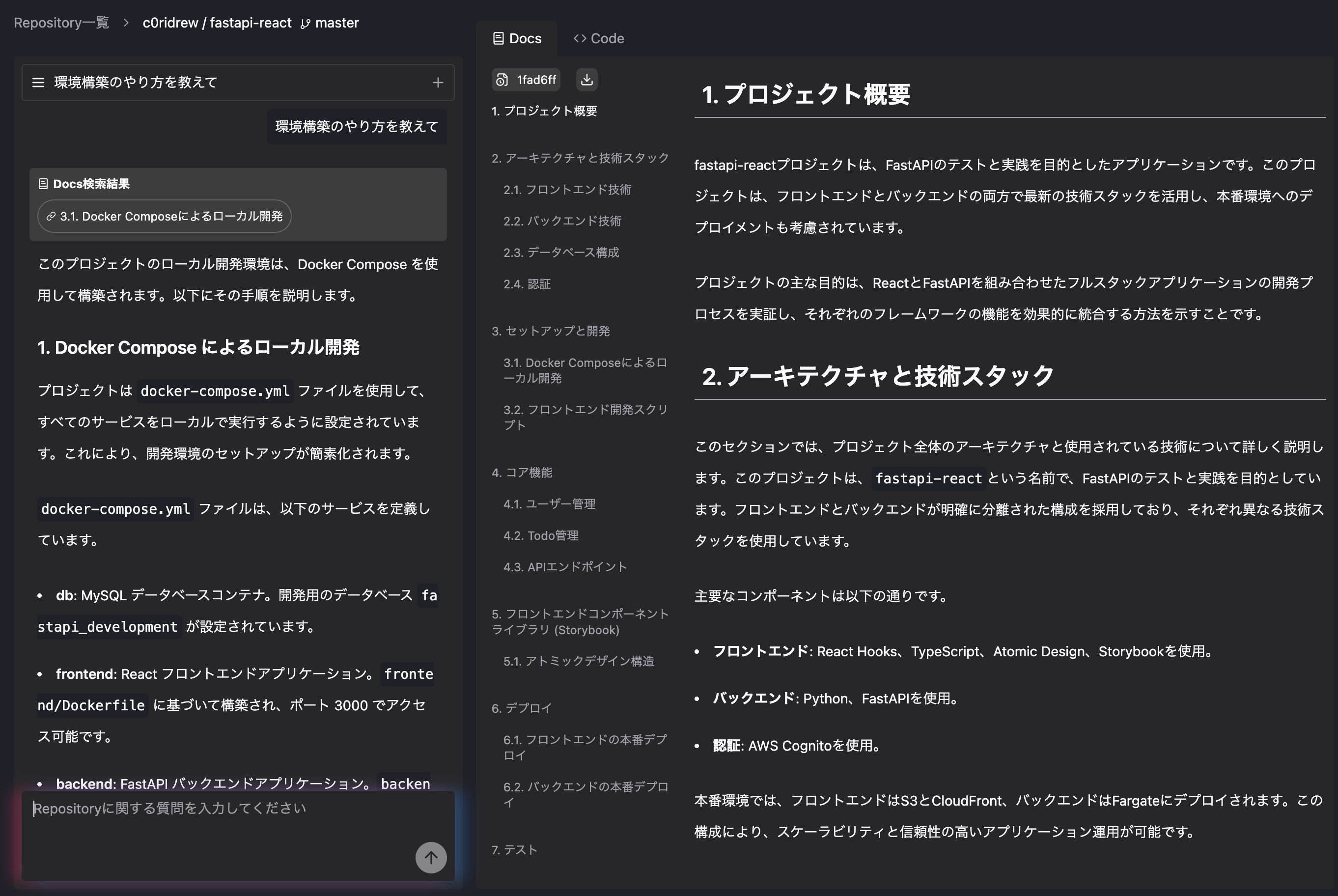 作成されたドキュメントや、連携したソースコードの内容について、AIに直接質問することができます。