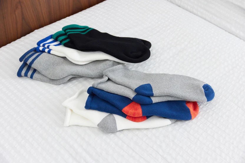 ゆっくりと時間をかけて丁寧に編み立てることで生まれる、柔らかく立体的な形状を持ちます。しっかり弾力のある厚みと、ふわふわした軽やかさで、もちふわな履き心地を実現した靴下です。