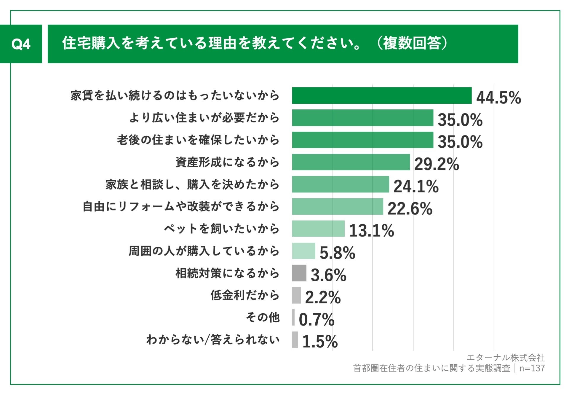 Q3で「将来的には必ず購入したい」「将来的には購入したい」と回答した方に、「Q4.住宅購入を考えている理由を教えてください。(複数回答)」(n=137)と質問したところ、「家賃を払い続けるのはもったいないから」が44.5%、「より広い住まいが必要だから」が35.0%、「老後の住まいを確保したいから」が35.0%という回答となりました。