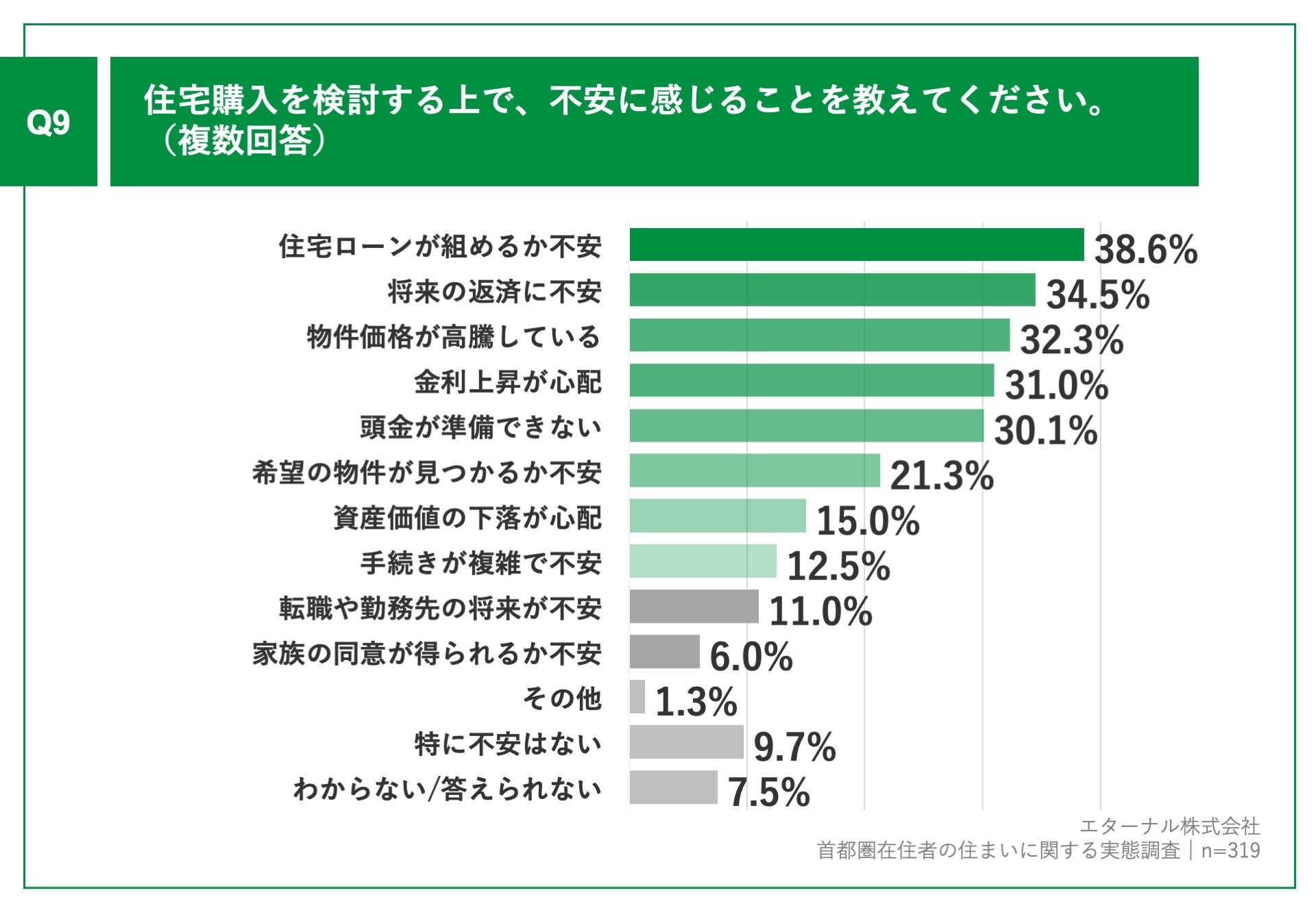 「Q9.住宅購入を検討する上で、不安に感じることを教えてください。(複数回答)」(n=319)と質問したところ、「住宅ローンが組めるか不安」が38.6%、「将来の返済に不安」が34.5%、「物件価格が高騰している」が32.3%という回答となりました。
