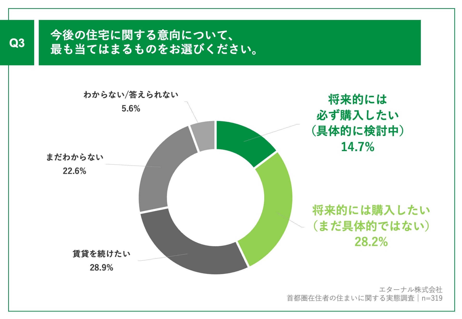 「Q3.今後の住宅に関する意向について、最も当てはまるものをお選びください。」(n=319)と質問したところ、「将来的には必ず購入したい(具体的に検討中)」が14.7%、「将来的には購入したい(まだ具体的ではない)」が28.2%という回答となりました。