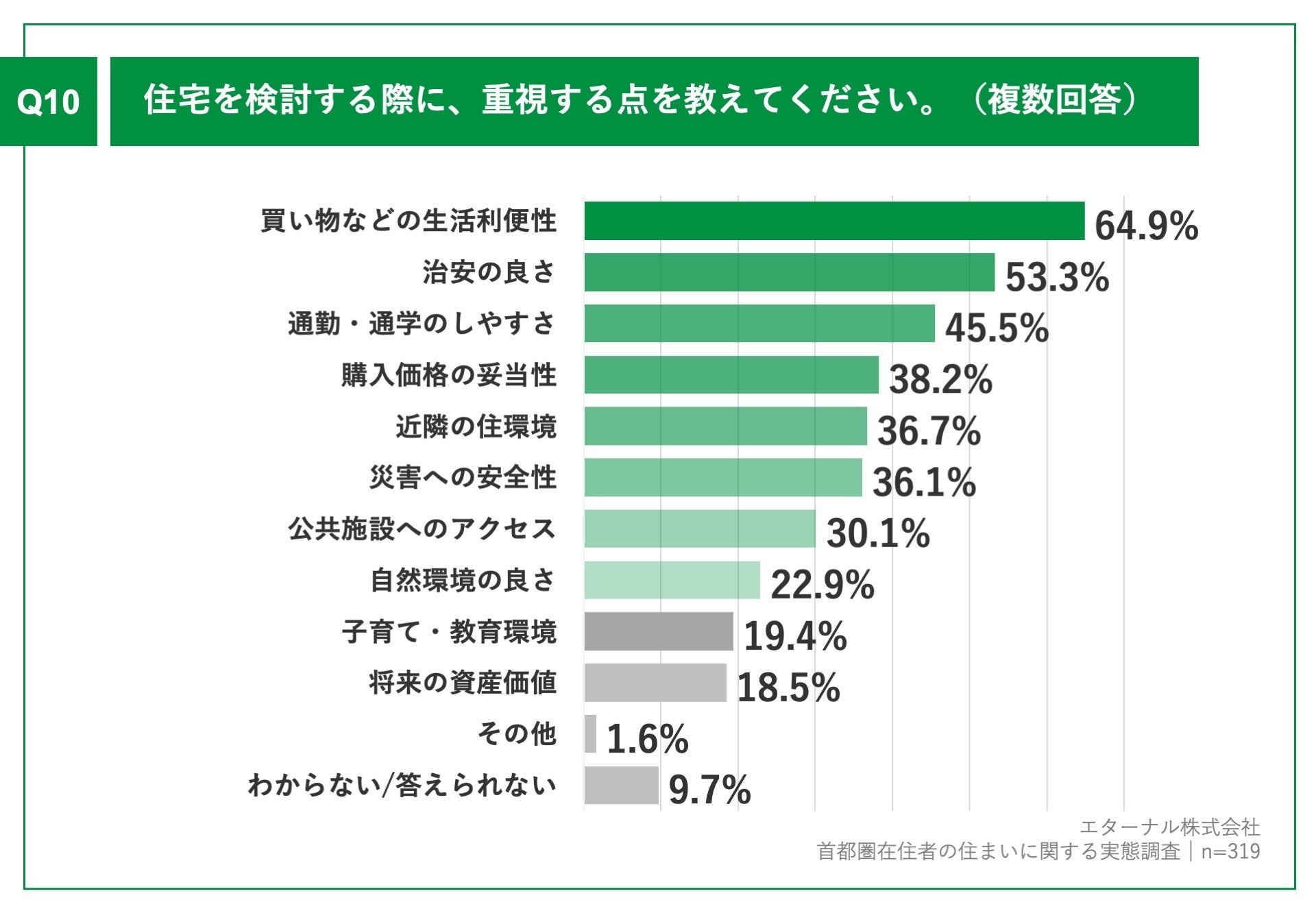 「Q10.住宅を検討する際に、重視する点を教えてください。(複数回答)」(n=319)と質問したところ、「買い物などの生活利便性」が64.9%、「治安の良さ」が53.3%、「通勤・通学のしやすさ」が45.5%という回答となりました。