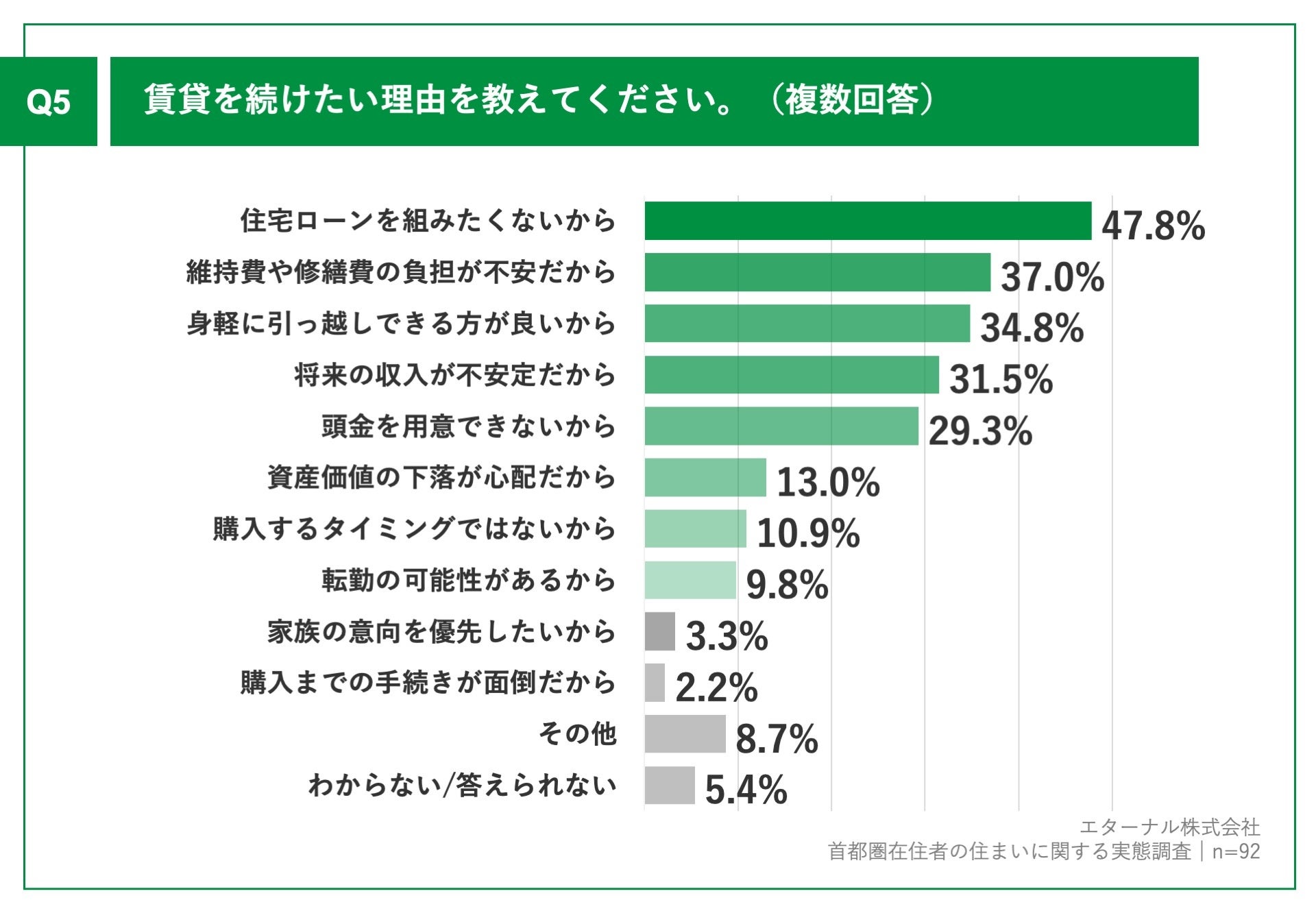 Q3で「賃貸を続けたい」と回答した方に、「Q5.賃貸を続けたい理由を教えてください。(複数回答)」(n=92)と質問したところ、「住宅ローンを組みたくないから」が47.8%、「維持費や修繕費の負担が不安だから」が37.0%、「身軽に引っ越しできる方が良いから」が34.8%という回答となりました。