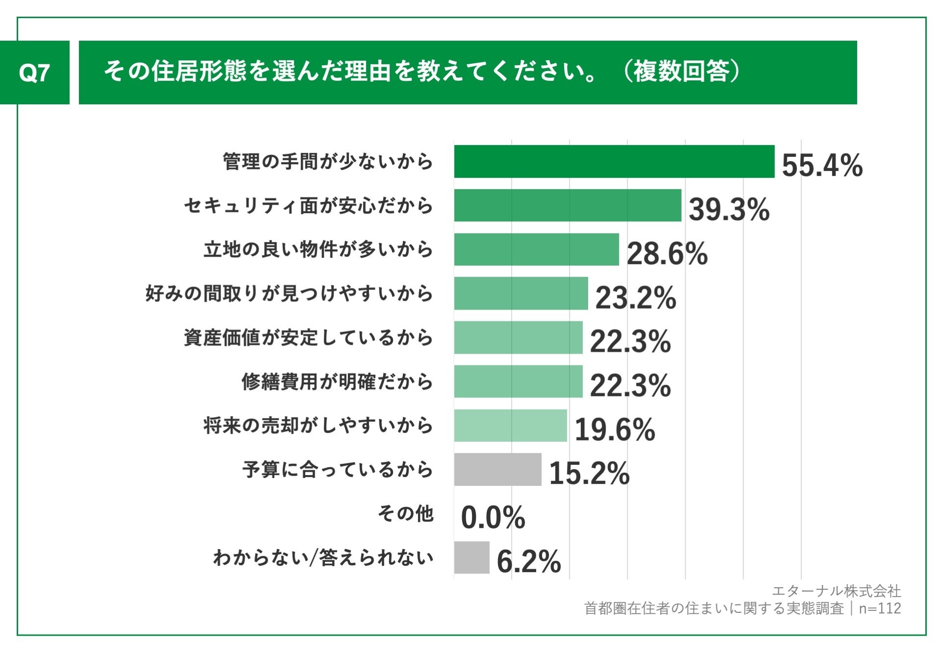 Q6で「マンション」と回答した方に、「Q7.その住居形態を選んだ理由を教えてください。(複数回答)」(n=112)と質問したところ、「管理の手間が少ないから」が55.4%、「セキュリティ面が安心だから」が39.3%、「立地の良い物件が多いから」が28.6%という回答となりました。