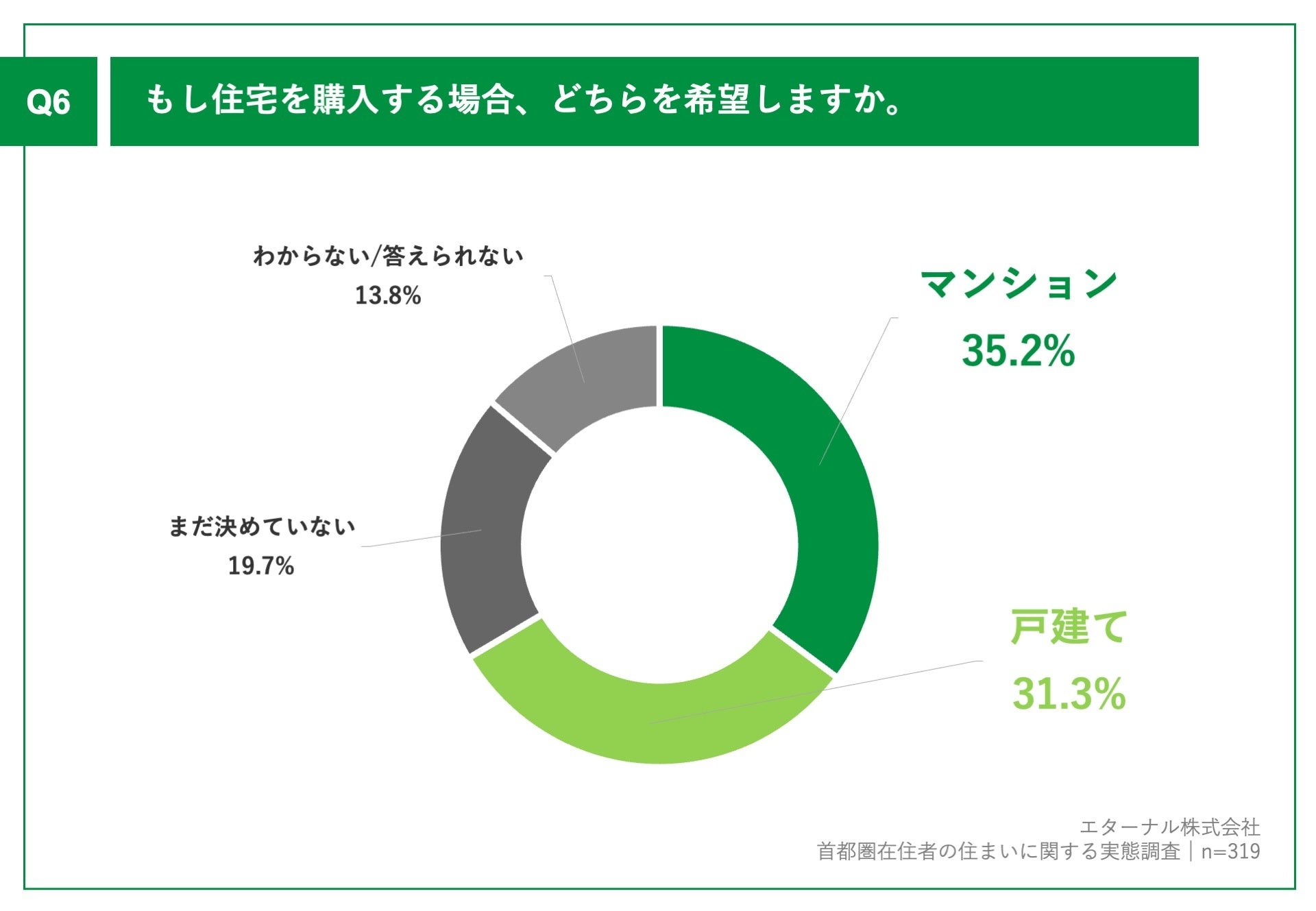 「Q6.もし住宅を購入する場合、どちらを希望しますか。」(n=319)と質問したところ、「マンション」が35.2%、「戸建て」が31.3%という回答となりました。