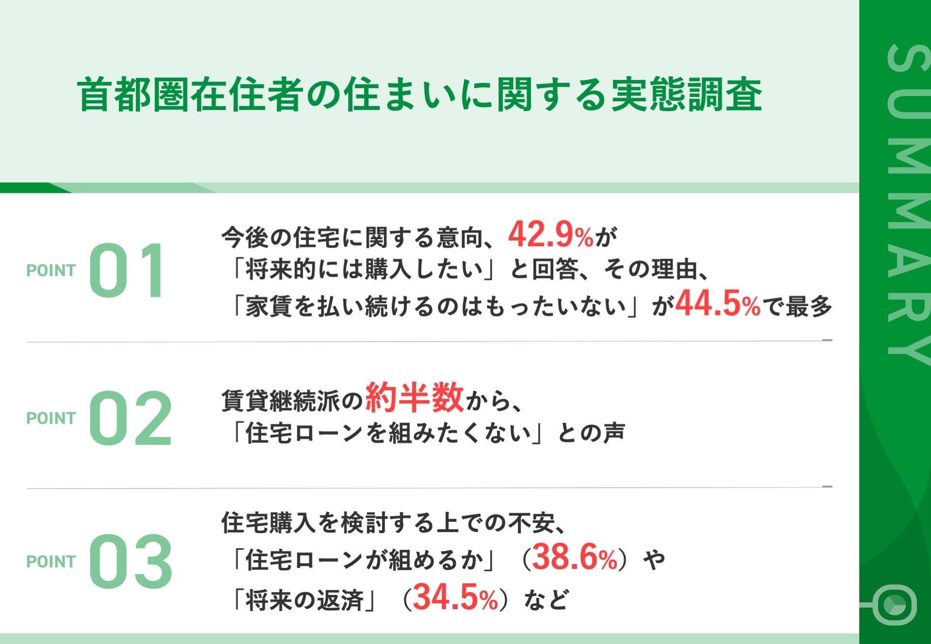 【首都圏の賃貸居住者、住宅購入の意向は?】42.9%が住宅購入を検討するも、「住宅ローンが組めるか」「将来の返済」の不安あり