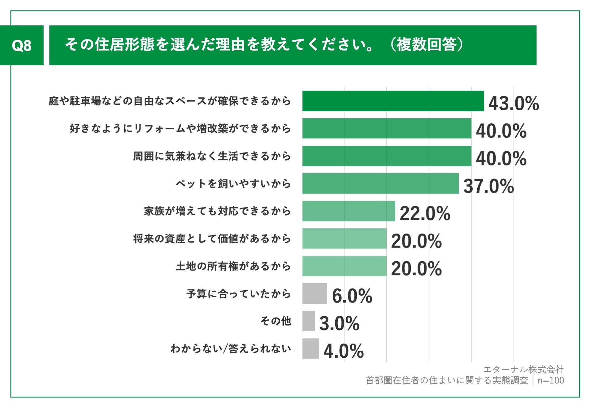 Q6で「戸建て」と回答した方に、「Q8.その住居形態を選んだ理由を教えてください。(複数回答)」(n=100)と質問したところ、「庭や駐車場などの自由なスペースが確保できるから」が43.0%、「好きなようにリフォームや増改築ができるから」が40.0%、「周囲に気兼ねなく生活できるから」が40.0%という回答となりました。