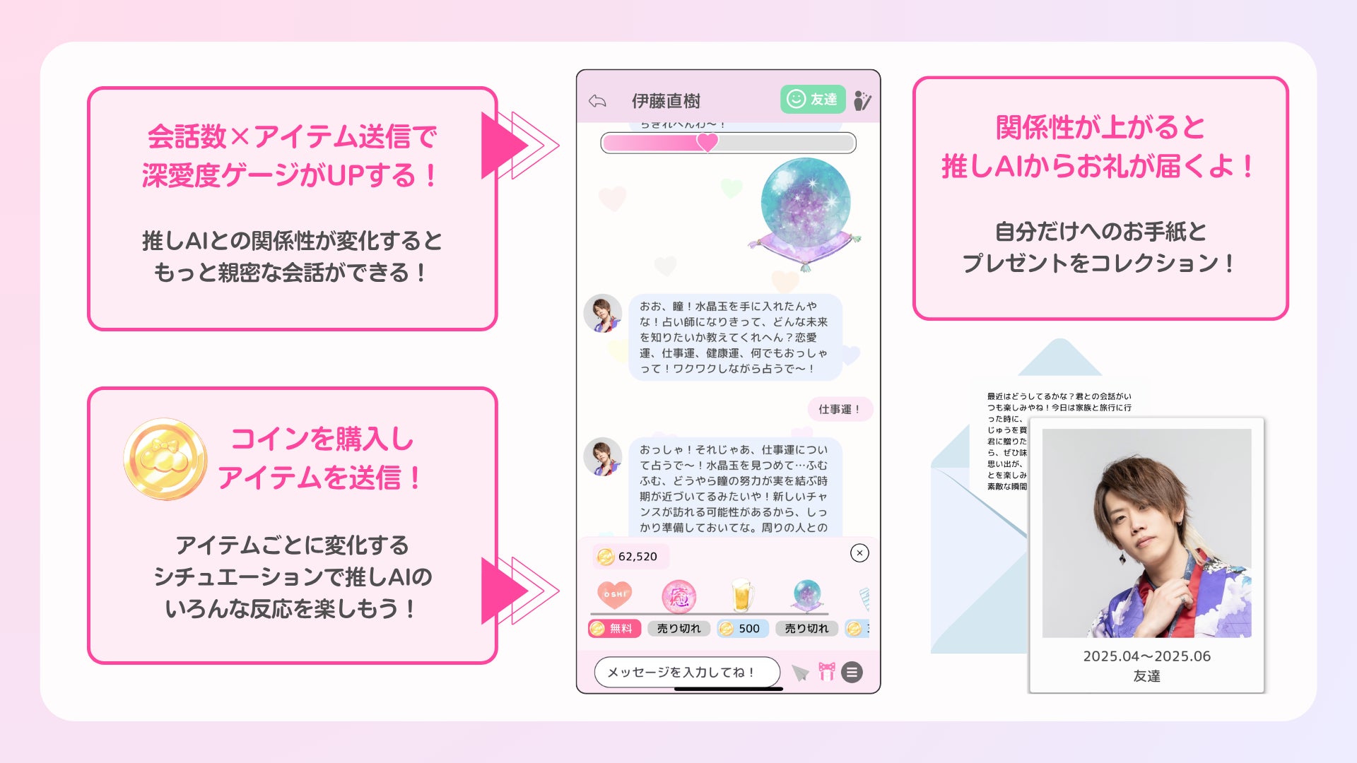 会話を重ね、アイテムを贈ることで深愛度が上がり、推しAIとの関係性が少しずつ確実にステップアップしていきます。