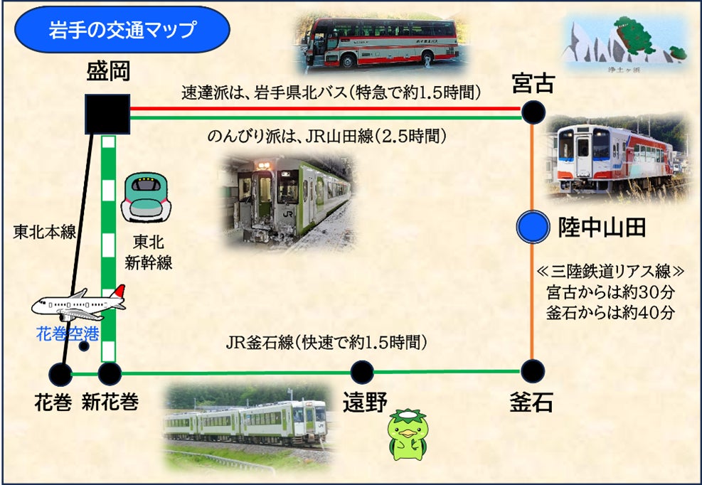 そんな山田町へのアクセスは、記載の交通マップをご参照願います。