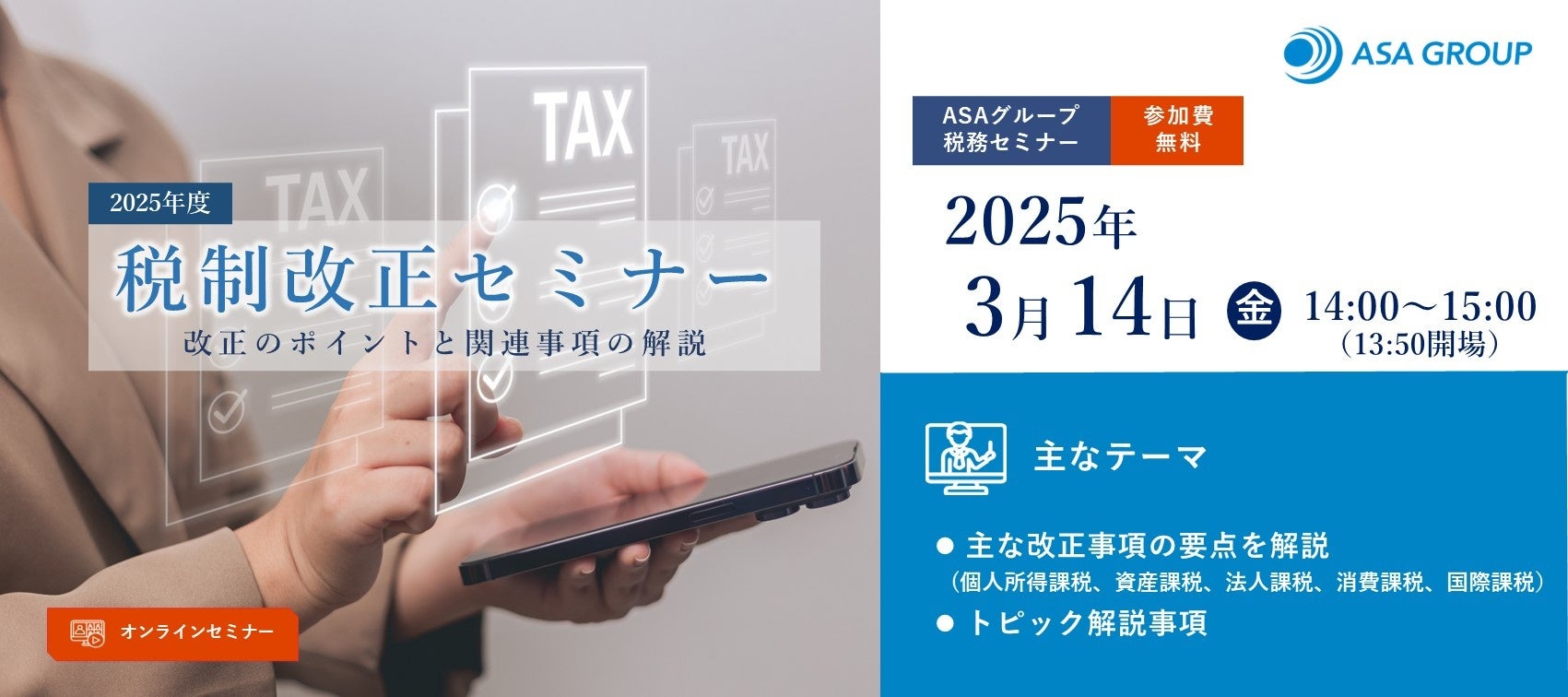 国内5拠点とシンガポールを拠点に、金融・会計・税務・コンサルティングサービスを提供するASAグループ(本社:東京都港区、グループ代表:松澤 和浩、粟国 正樹)は、2025年3月14日(金)14:00〜15:00に、「2025年度税制改正セミナー」と題するオンラインセミナーを開催いたしますので、お知らせいたします。