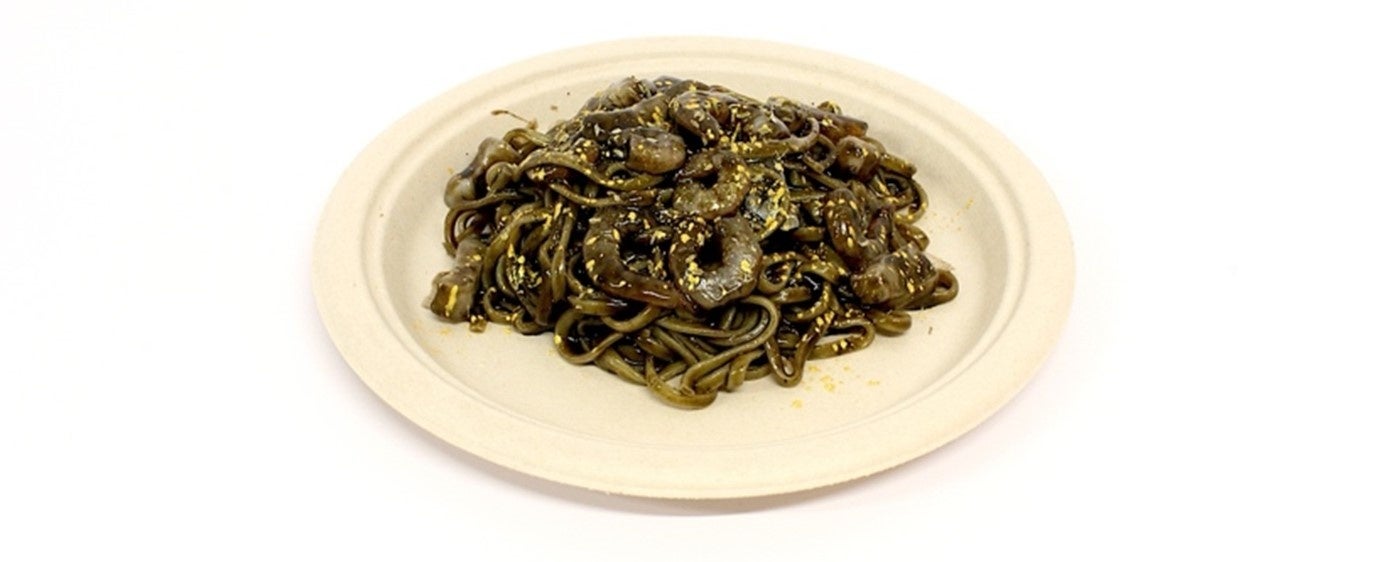 ゴールドの神秘的な輝きと黒い宝石をイメージしたイカスミパスタ