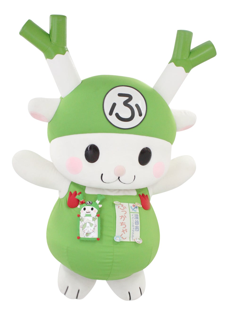 ルックス:ウサギのようでシカのような「ふっか」という生きもの。地元名産「深谷ねぎ」のしなやかで豪快な角が特徴。胸には、市の花「チューリップ」のボタン。とてもカワイイ、あま~いマスクで深谷市の魅力を発信中!
