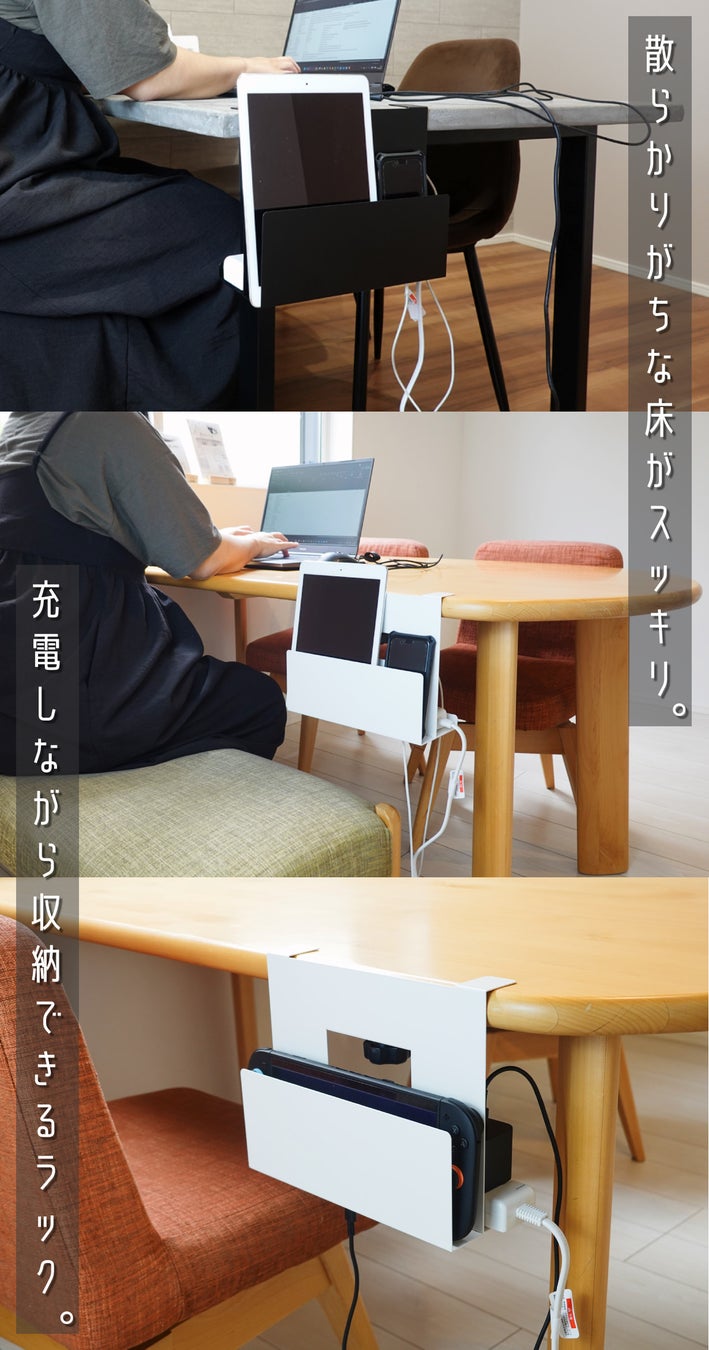 充電しながら収納できるラック「テーブルサイド充電ラック」を開発。ダイニングテーブルやデスクの天板に簡単に取り付けられ、調節ネジを使ってしっかりと固定でき、机のスペースを占有しがちな携帯電話、iPad、Switchなども充電しながらすっきりと収納できます。クラウドファンディングサービス「Makuake」にて10月22日11時より先行販売を開始し、わずか6時間で目標金額を達成いたしました!