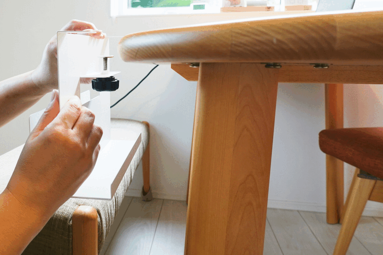 設置は穴開け不要で、引っ掛け部分でテーブルやデスクの天板を挟み込んで、調節ネジで固定するだけ。