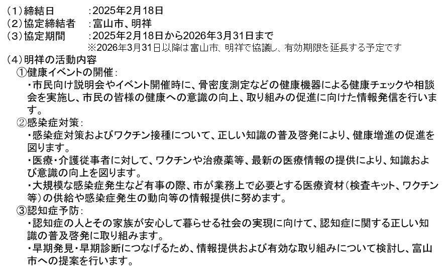 今回の協定締結を通じて、明祥は富山市と連携し、富山市民の皆様の健康づくりに係る施策の充実を図るため、健康イベントの開催や、ワクチン接種および認知症に関する正しい知識の普及啓発等を行います。また、認知症の早期発見・早期診断につながる効果的な施策を検討し、富山市に対して提案を行います。