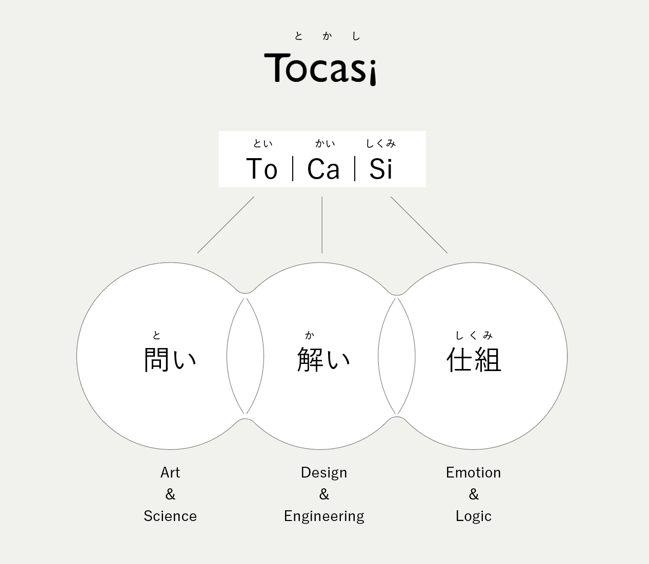 Tocasiは、「Toi-問い」、「Cai-解い」、「Sikumi-仕組」のプロフェッショナル達が集い、領域や立場の垣根を ”とかし” て融合を促進させる触媒として、組織の持続的発展を共創する Social Co-Creation Studio です。私たちは、組織の持続的な発展を追求し、アートやデザインなど創造的思考を活かした組織づくりやまちづくりに取り組んでいます。そして、いつか必ず「水平線の上に立つ」日が訪れると信じています。
