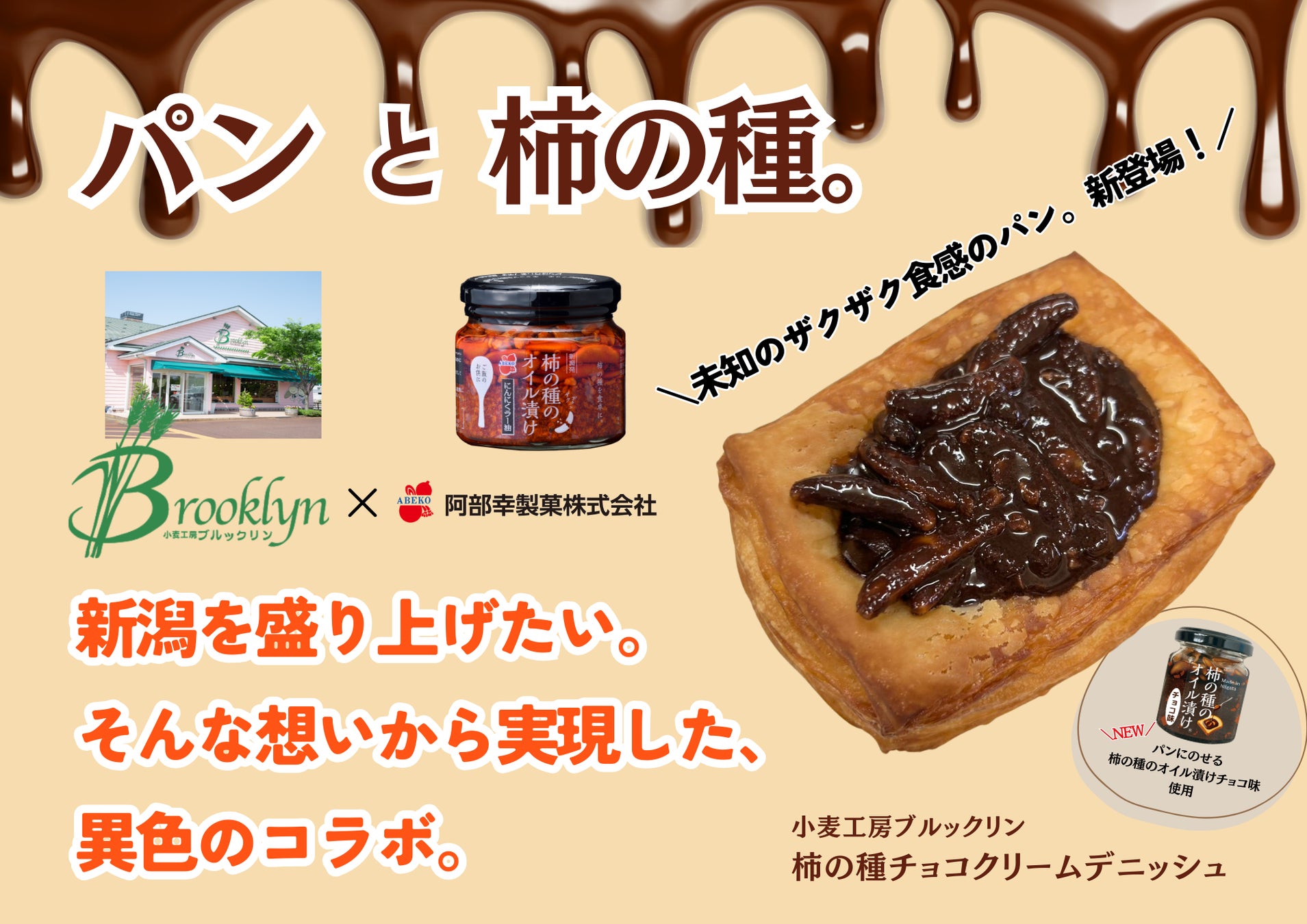 株式会社ブルックリン(本社:新潟県長岡市、代表:長谷川啓太)は、阿部幸製菓株式会社様(本社:新潟県小千谷市)が開発した甘味系新商品「パンにのせる柿の種のオイル漬 チョコ味」を全面に打ち出したコラボ商品「柿の種チョコクリームデニッシュ」を12月18日(木)より製造販売いたします。こちらは当社ブルックリン長岡店・上越店にて期間限定での販売となります。
