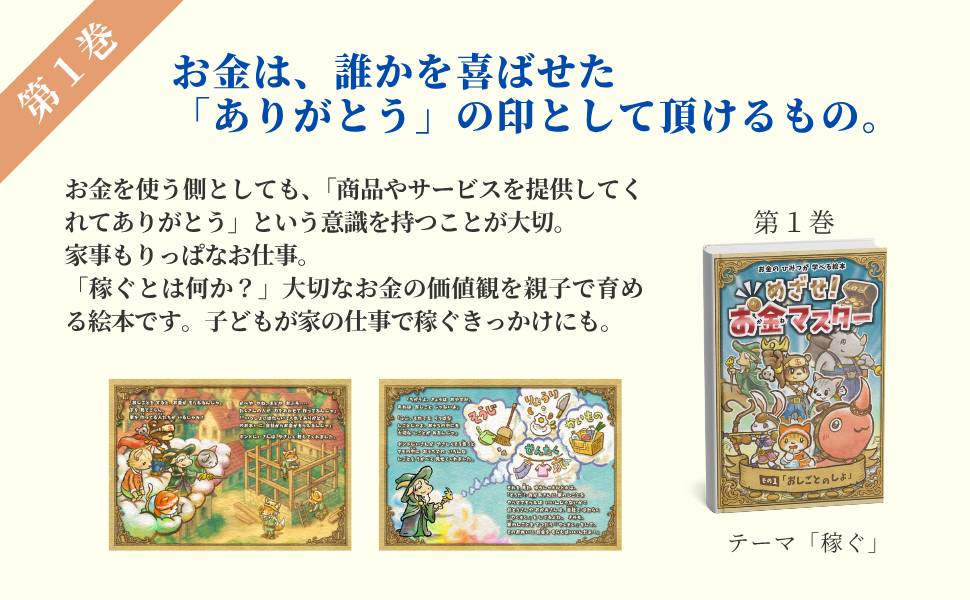 こうした社会課題を背景に、金融教育の第一人者 塚本俊太郎氏(元金融庁・高校金融教育導入担当/NHK Eテレ講師) の全面監修のもと、親子で楽しく「投資の仕組み」や「感謝と価値のつながり」を学べる絵本『めざせ!お金マスター』全3巻が完成。
