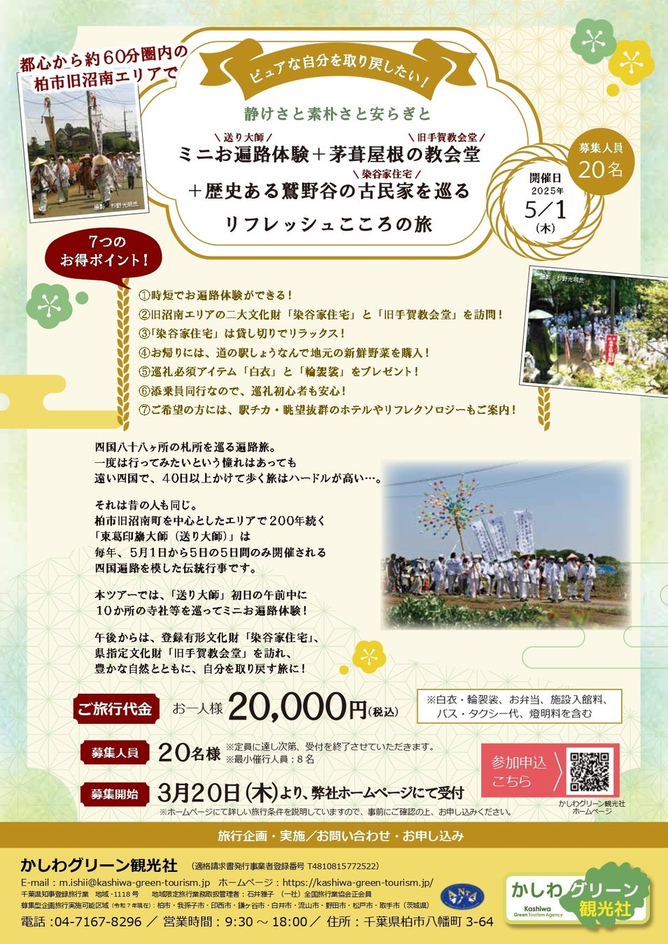 千葉県柏市では、四国遍路を模した「東葛印旛大師(送り大師)」という伝統行事が毎年5月1日から5日までの5日間おこなわれていますが、かしわグリーン観光社では、初日の午前中、この行事に参加して「ミニお遍路体験」をできるツアーを商品化。さらに、午後からは柏市旧沼南エリアの2つの文化財をめぐり、自然豊かな農村地帯で、お客様にリフレッシュしていただくツアーを提供いたします。