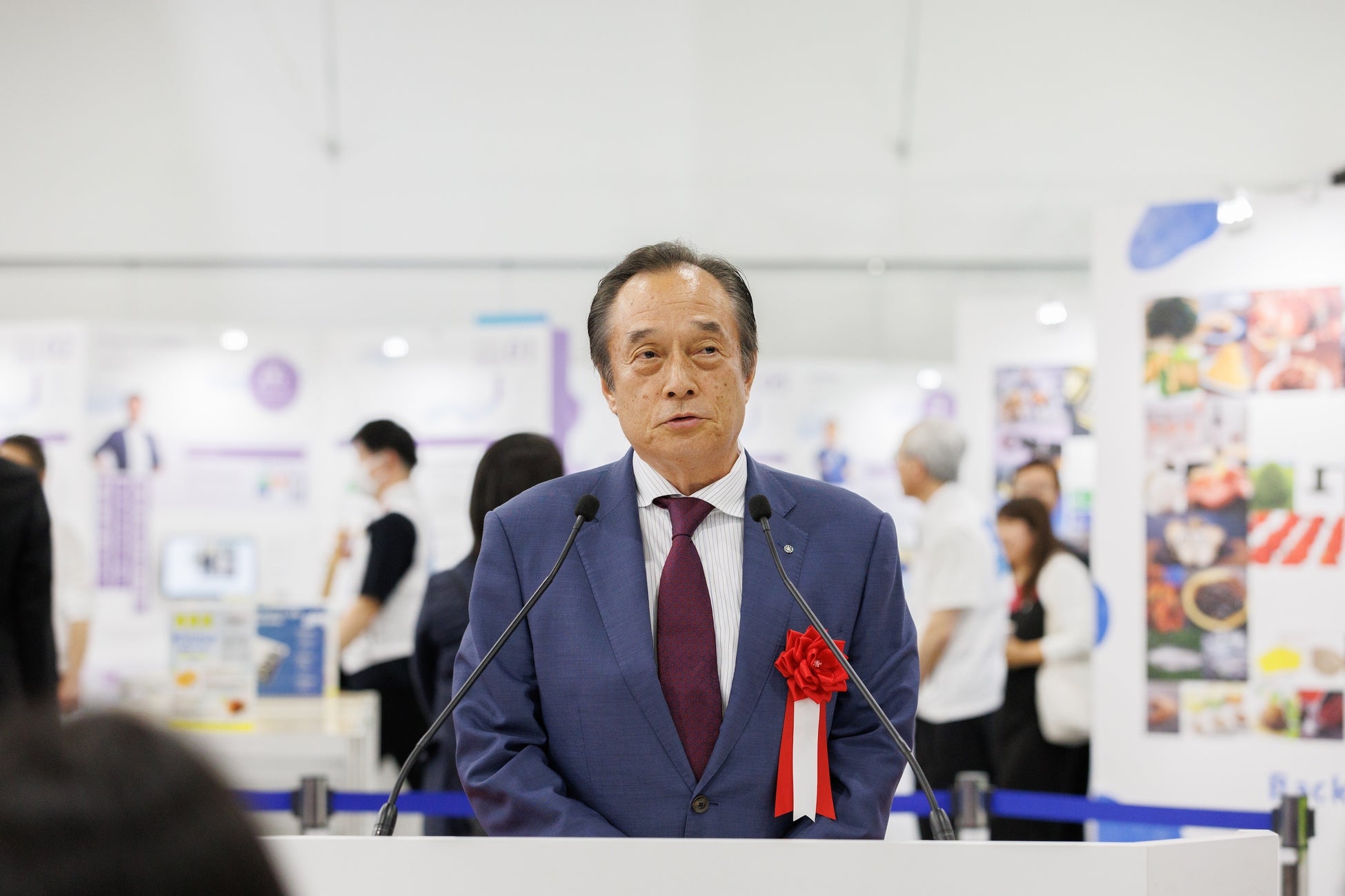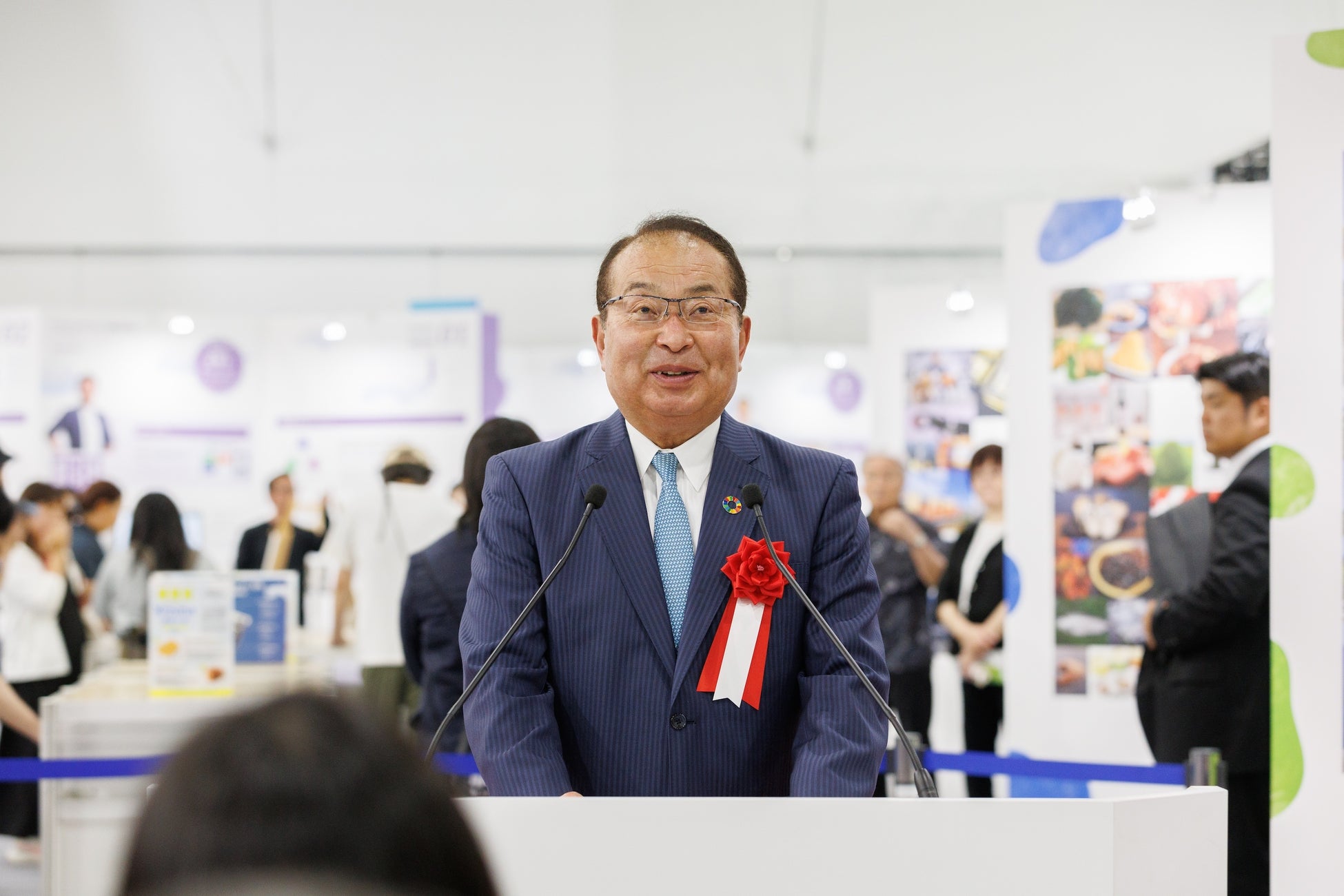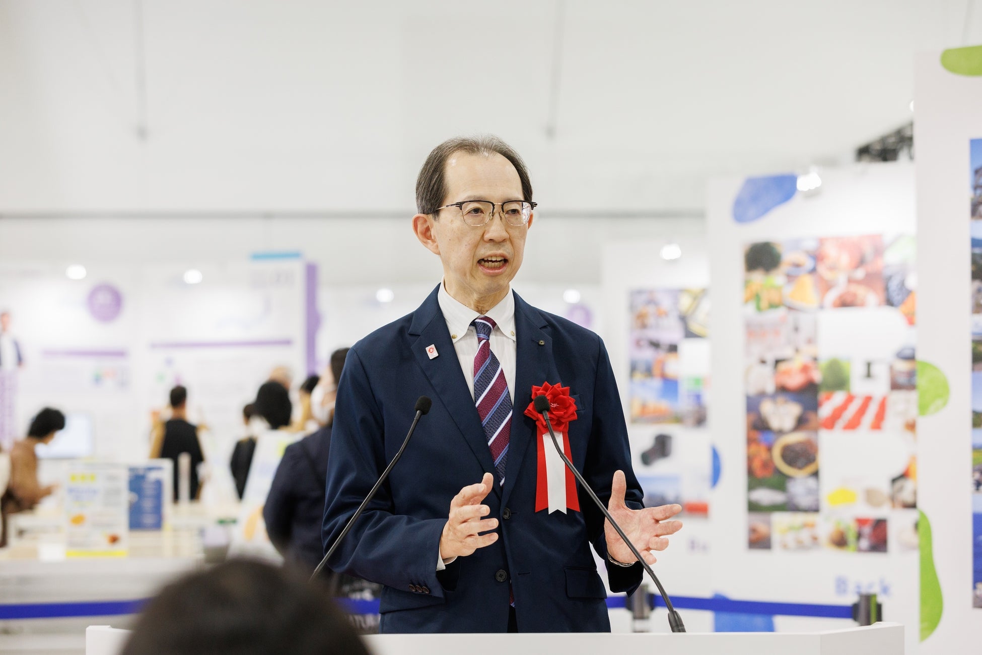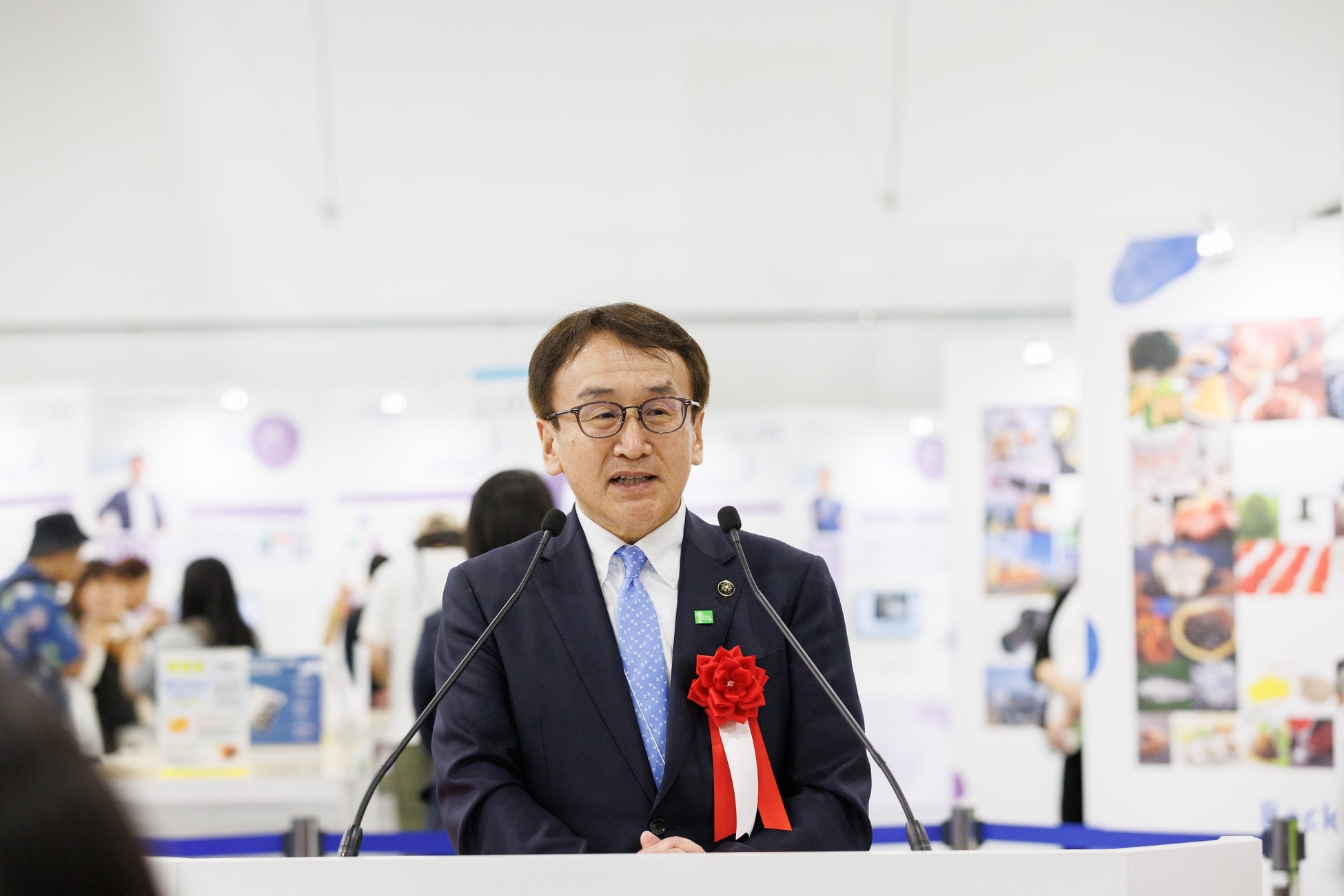 はじめに、主催者を代表して、伊藤復興大臣が挨拶されました。列席者にご出席賜ったことに感謝を述べつつ、「本日5月19日月曜日から24日土曜日までの6日間、「復興庁万博テーマウィーク展示」を実施します。福島県、岩手県、宮城県の皆様方、自治体の皆様方をはじめとして多くの方々に多大なる御協力をいただき、被災地の復興しつつある姿やその魅力を発信する展示になっていると確信しています。避難者の方々を含め多くの方々に、大阪・関西万博のこの機会を使って、被災地まで足を運んでいただくためにも、まずは、一人でも多くの方々に復興庁の展示に足を運んでいただきたいと思います。そのためには、復興庁の展示に人々の注目を集める必要があり、本日のオープニングセレモニーがそのきっかけとなれば幸いです。復興庁の展示が、来場者と被災地を結ぶきっかけとなり、復興につながることを祈念します」と締めくくると、周囲から拍手が起きました。