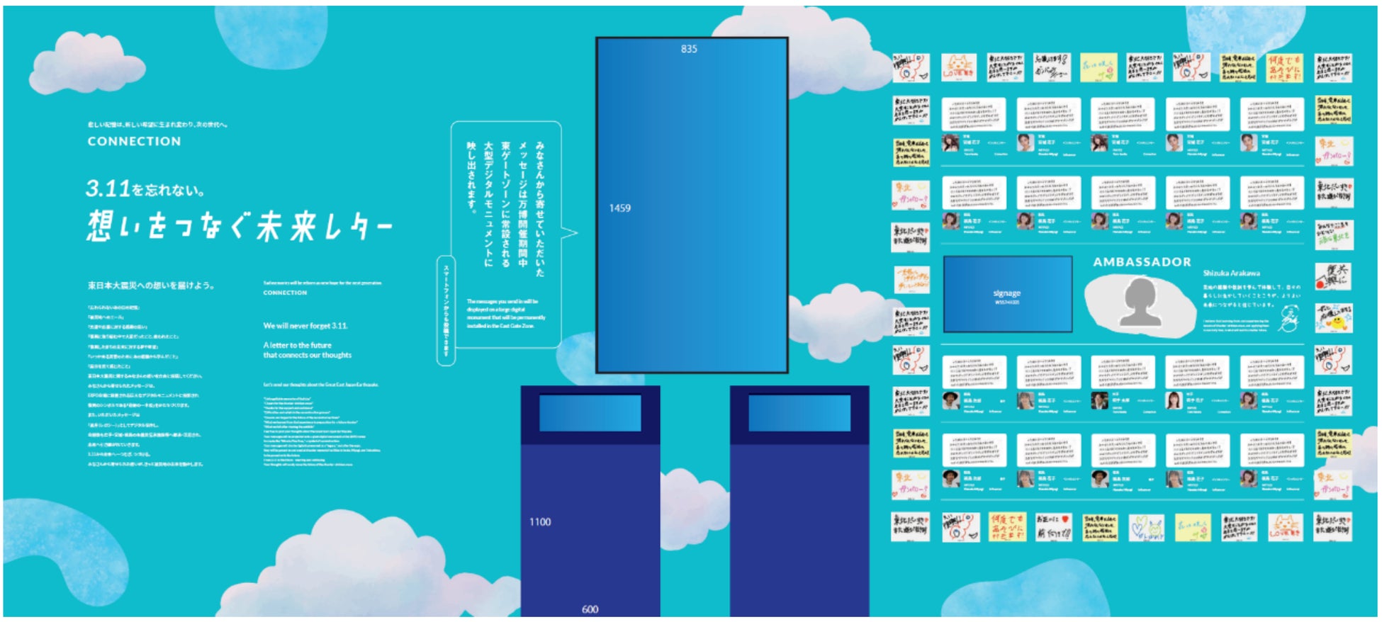 2つ目は、3.11や復興についての想いを投稿できるメッセージ入力コーナー。皆さまから投稿いただいたメッセージは、復興のシンボルである「奇跡の一本松」を模したデジタルモザイクアートとなり成長していきます。このメッセージは万博会場の東ゲートゾーンに常設展示するデジタルモニュメント「成長する『奇跡の一本松』」(※)に投影されます。