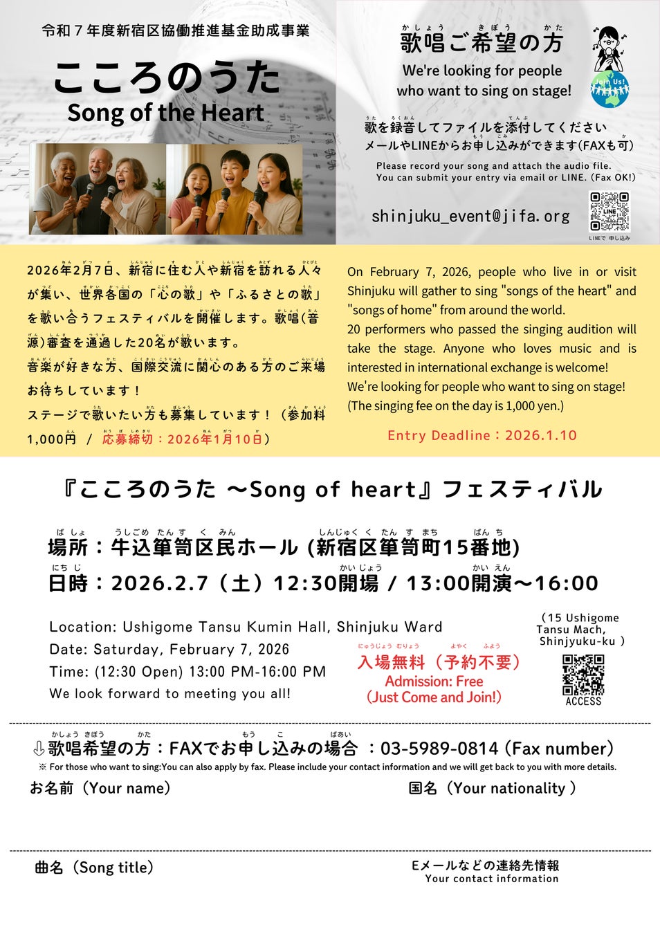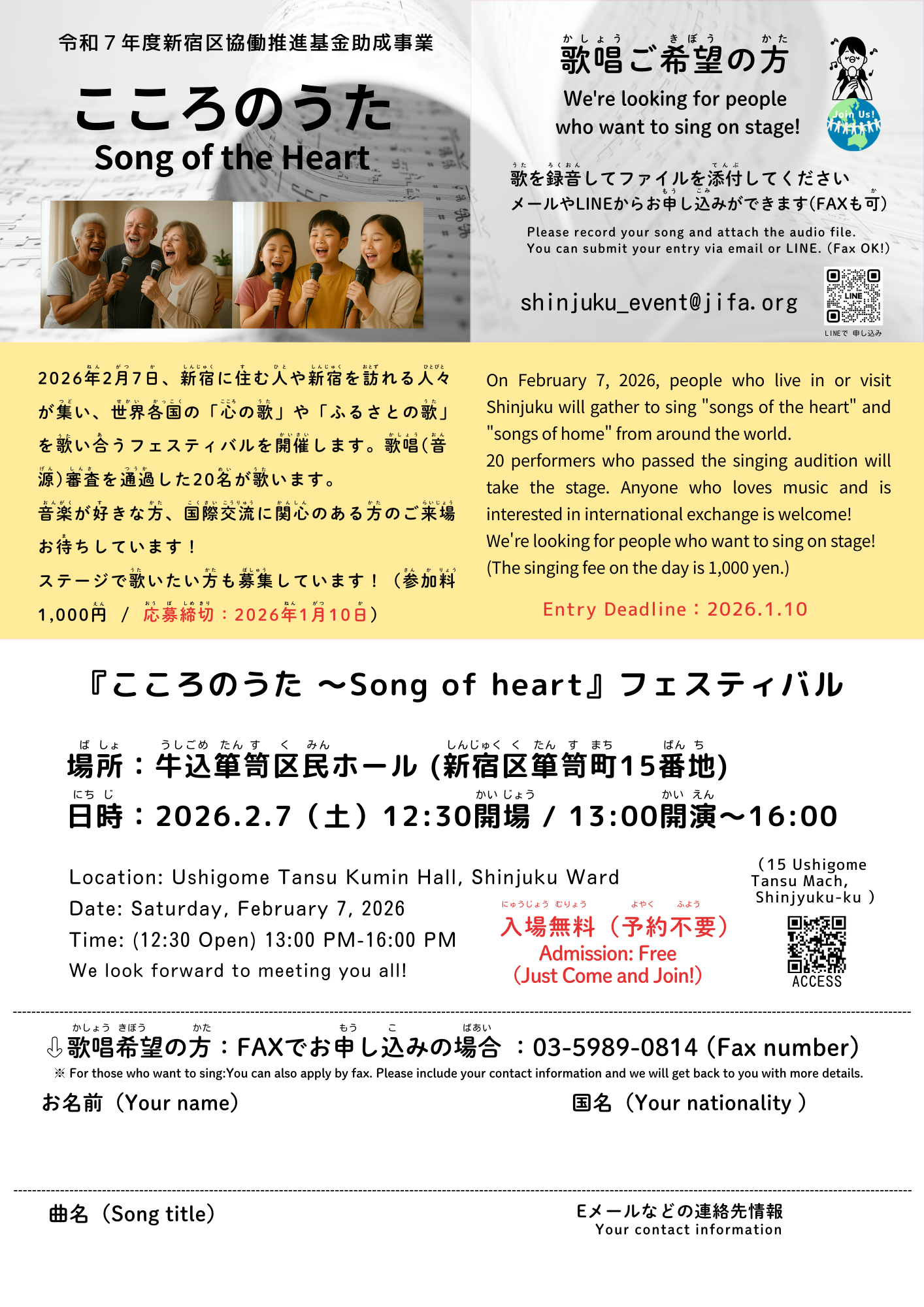 本イベントは、令和7年度 新宿区協働推進基金助成事業として実施され、日本人と外国人がそれぞれの「心の歌」「ふるさとの歌」を歌い合い、世代や国籍を越えて心を通わせるフェスティバルです。
