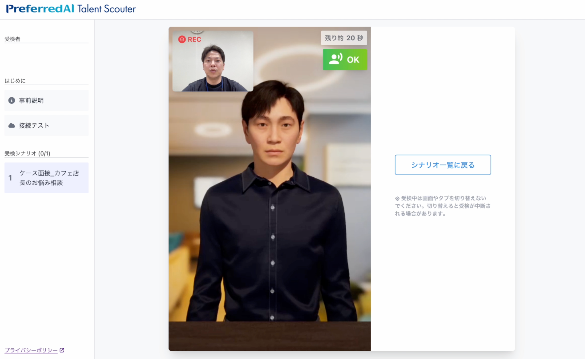 PreferredAI Talent Scouterは、AIアバターとの対話ロールプレイを通じて求職者の実務におけるスキル適性の評価を支援するサービスです。従来の選考方法では評価が難しかった求職者の潜在能力、コミュニケーション能力、問題解決能力、ビジネス理解力などを多角的に評価することが可能です。これにより選考プロセスの効率化、優秀な人材の確保、面接官の負担軽減、求職者体験の向上などを支援します。
